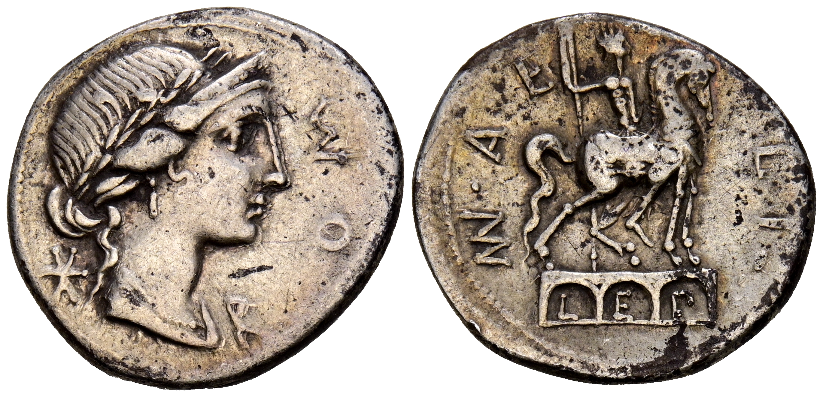 GENS AEMILIA. Denario. (Ar. 3,59g/19mm). 114-113 a.C. Ceca del sur de Italia. (FFC 103; Crawford 291/1). Anv: Cabeza laureada de Roma a derecha, detrás estrella, delante leyenda: ROMA. Rev: Estatua ecuestre sobre tres arcos a derecha, entre los arcos: LEP, alrededor leyenda: MN AEMILIO. MBC. Ligero tono.