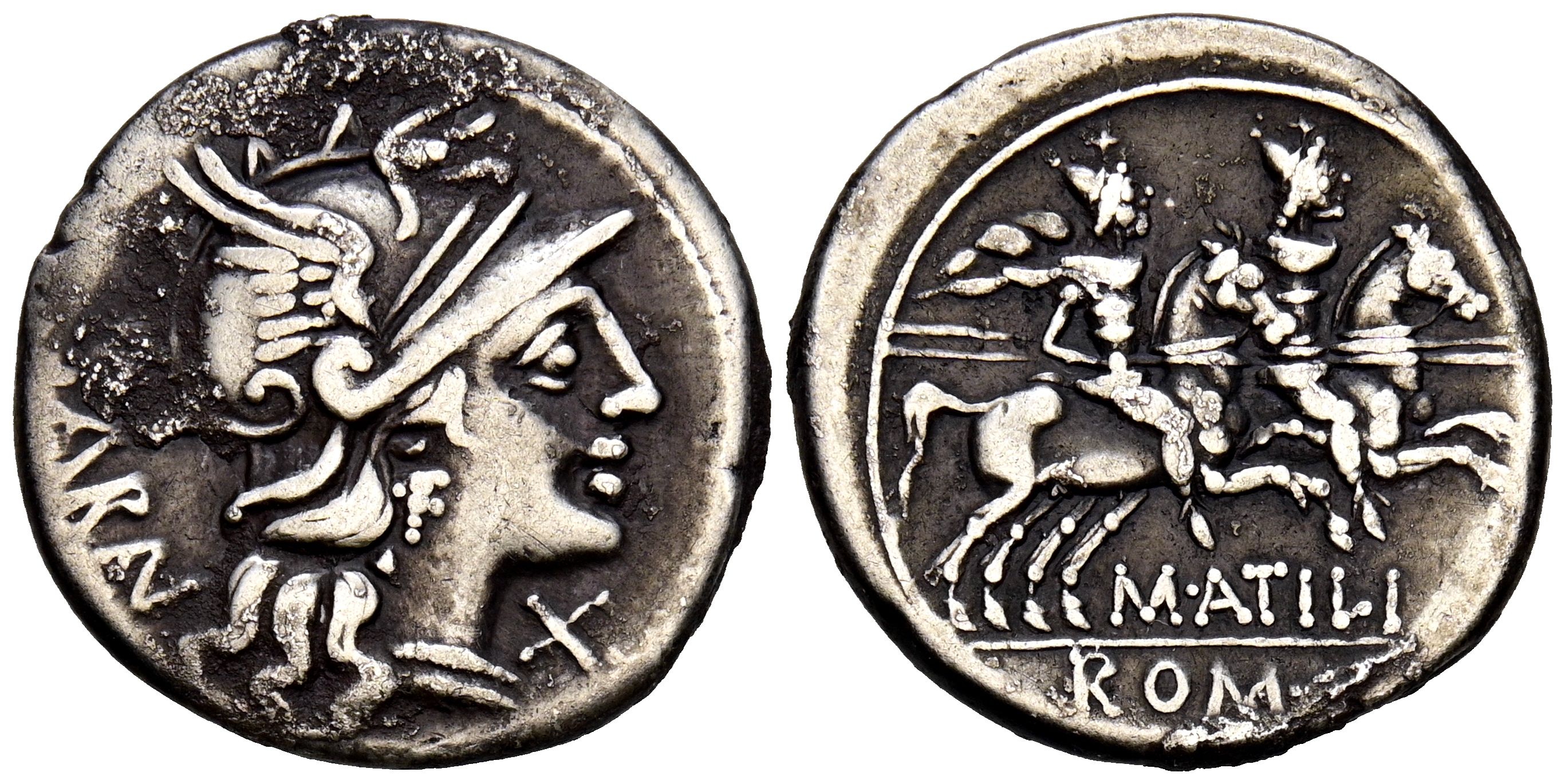 GENS ATILIA. Denario. (Ar. 3,71g/19mm). 148 a.C. Roma. (FFC 176; Crawford 214/1b). Anv: Cabeza de Roma a la derecha, delante: X, detrás: SARAN. Rev: Los Dioscuros a caballo a la derecha, encima estrellas, por debajo de la leyenda: M. ATILI, en exergo: ROMA. MBC. Depósitos.