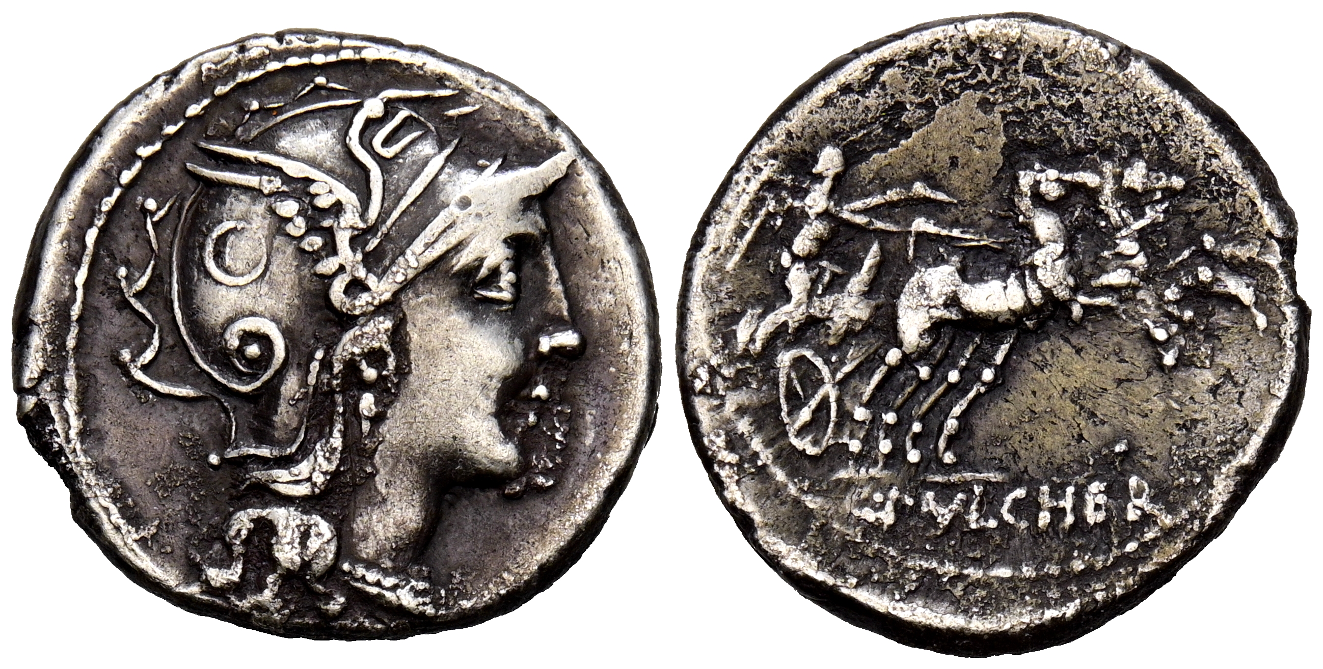 GENS CLAUDIA. Denario. (Ar. 3,73g/18mm). 110-109 a.C. Roma. (FFC 565; Crawford 300/1). Anv: Cabeza de Roma a derecha. Rev: Victoria conduciendo biga a derecha, en exergo: C PVLCHER. MBC. Depósitos.