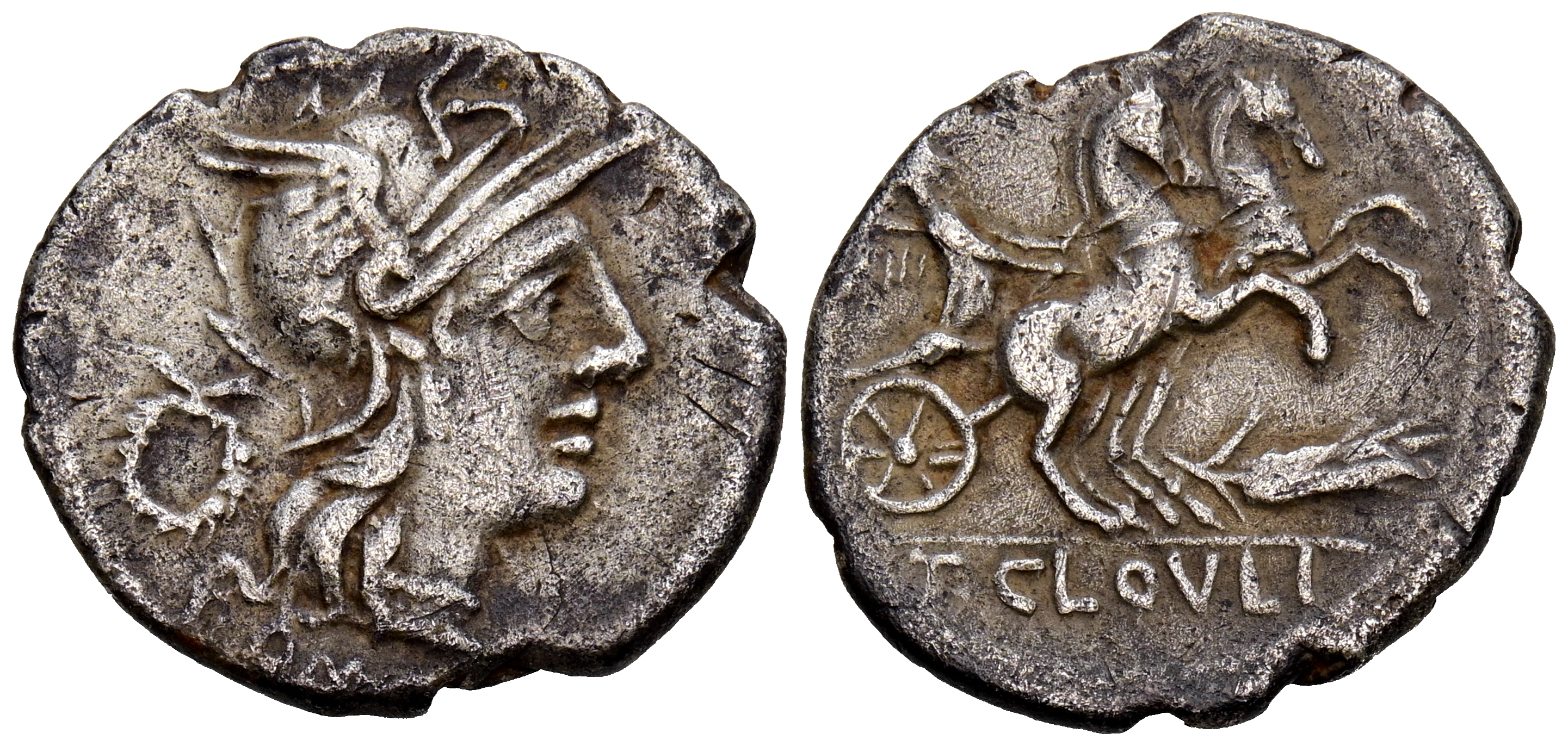 GENS CLOULIA. Denario. (Ar. 3,59g/20mm). 128 a.C. Roma. (FFC 572; Crawford 260/1). Anv: Cabeza de Roma a derecha, detrás corona de laurel, debajo leyenda: ROMA. Rev: Victoria dirigiendo biga a derecha, debajo espiga, en exergo: T CLOVLI. MBC-.