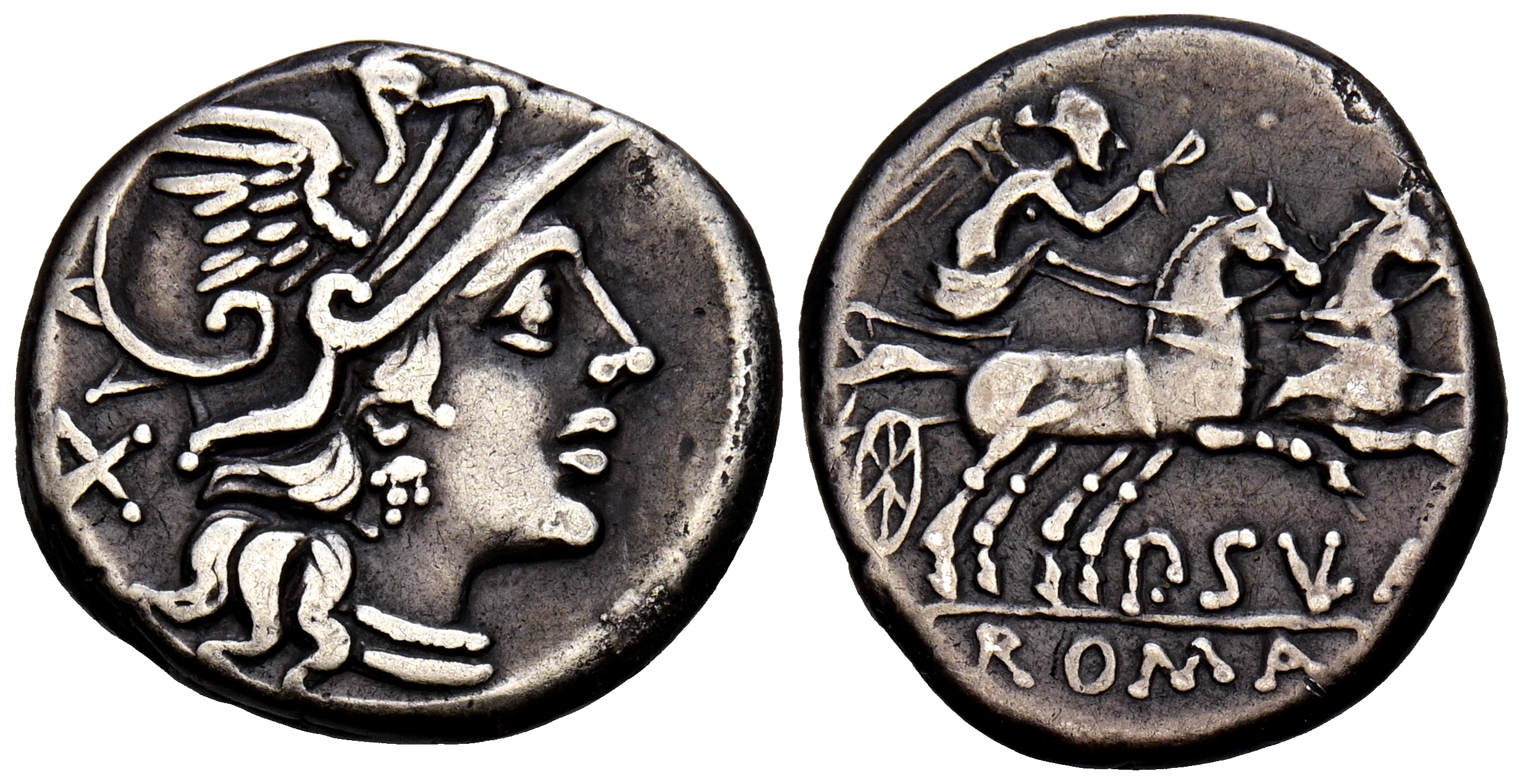 GENS CORNELIA. Denario. (Ar. 3,67g/18mm). 151 a.C. Roma. (FFC 607; Crawford 205/1). Anv: Cabeza de Roma a derecha, detrás X. Rev: Victoria con látigo en biga a derecha, debajo leyenda: P SVLA, en exergo: ROMA. MBC.