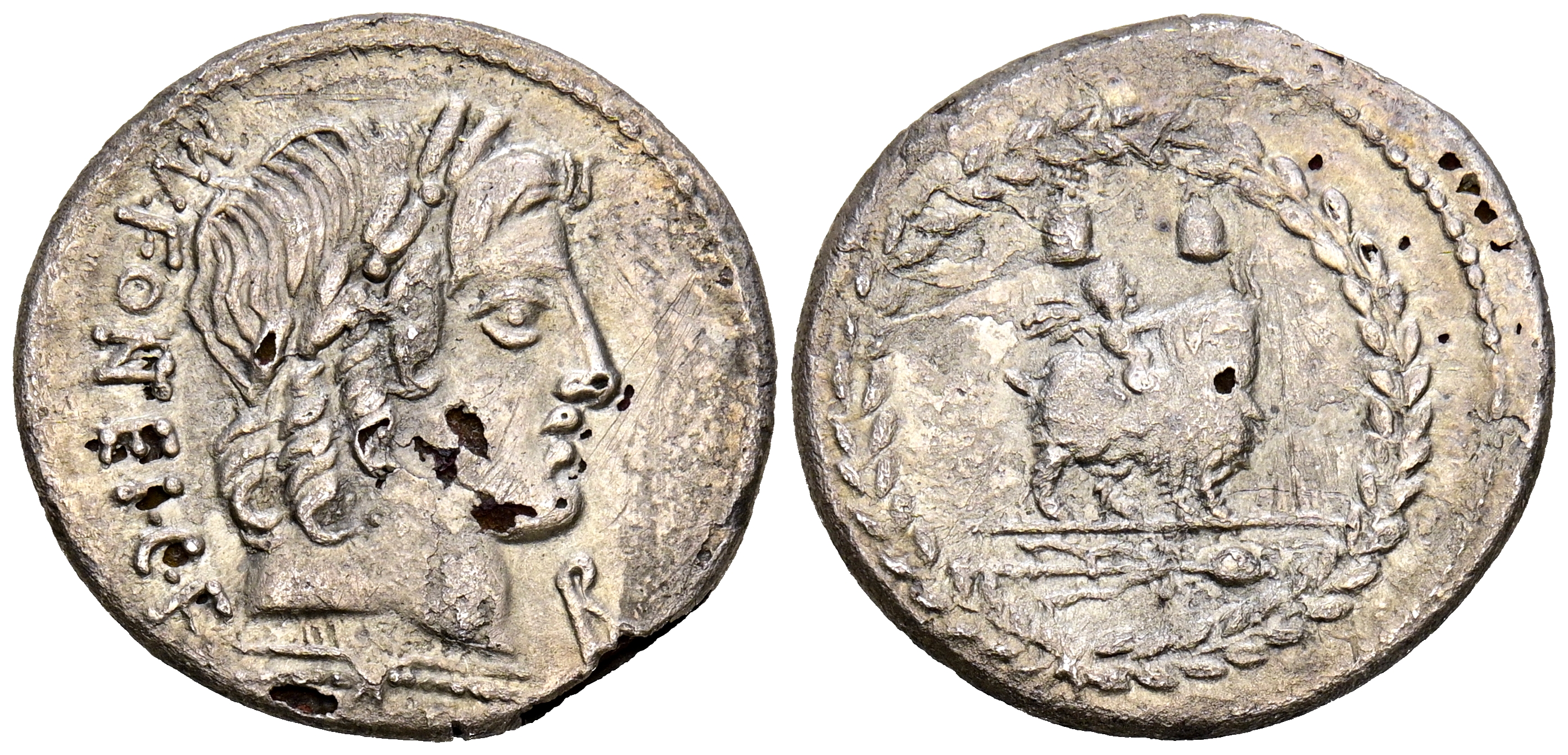 GENS FONTEIA. Denario forrado. (Ar-Ae. 3,07g/19mm). Año 85 a.C. Sur de Italia. (FFC 719; Crawford 353/1c). Anv: Cabeza laureada de Apolo a derecha, debajo haz de rayos, delante leyenda: C F, detrás leyenda: MN FONTEI. Rev: Genio sobre cabra a derecha, encima gorros de Dioscuros, debajo tirso, todo dentro de corona de laurel. MBC.