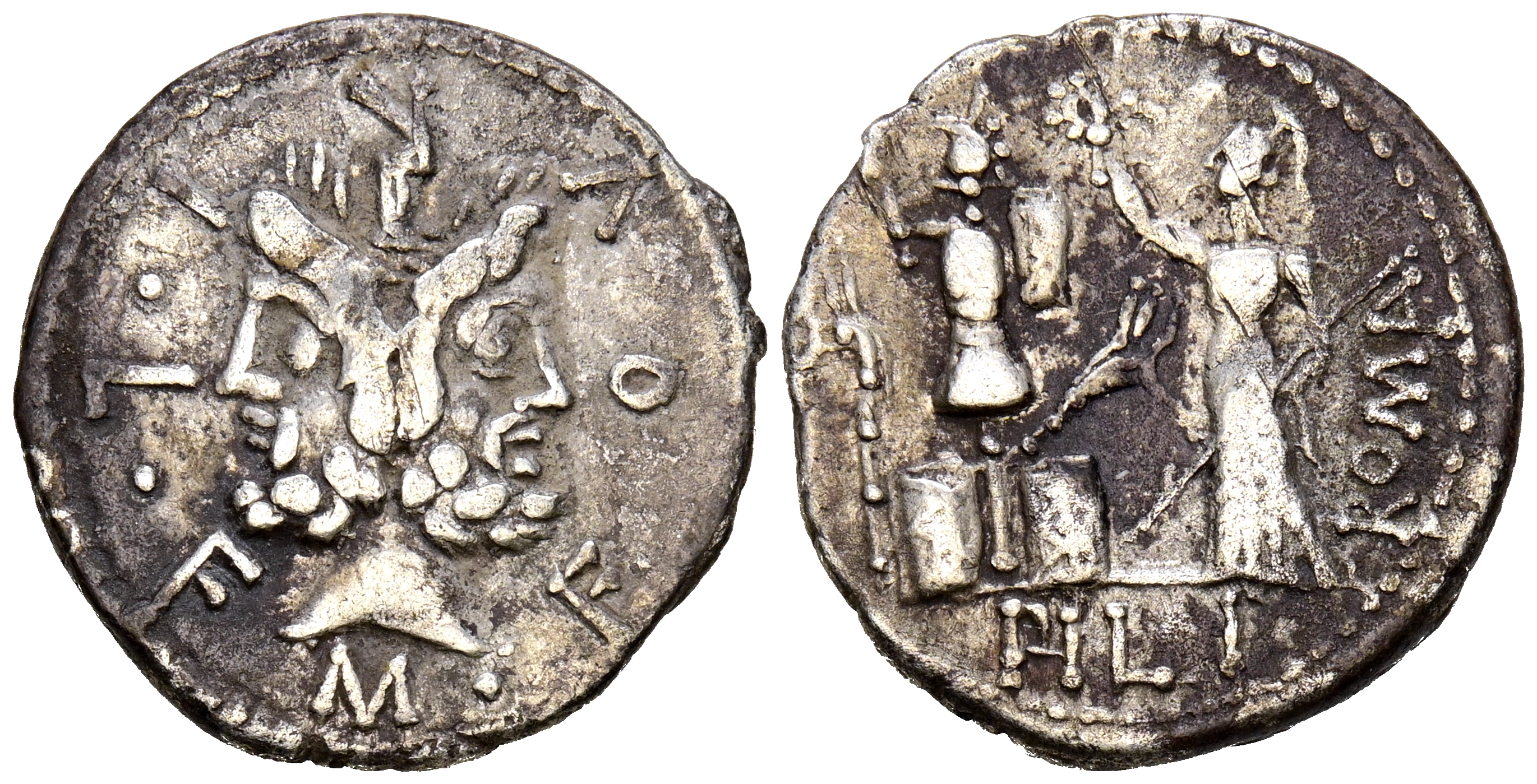 GENS FURIA. Denario. (Ar. 3,82g/19mm). 119 a.C. Italia Central. (FFC 730; Crawford 281/1). Anv: Cabeza de Jano bifronte, alrededor leyenda: M FOVRI LF. Rev: Roma estante a izquierda coronando trofeo, entreo dos escudos y dos carnyx, a derecha leyenda: ROMA, en exergo: PHILI. MBC.
