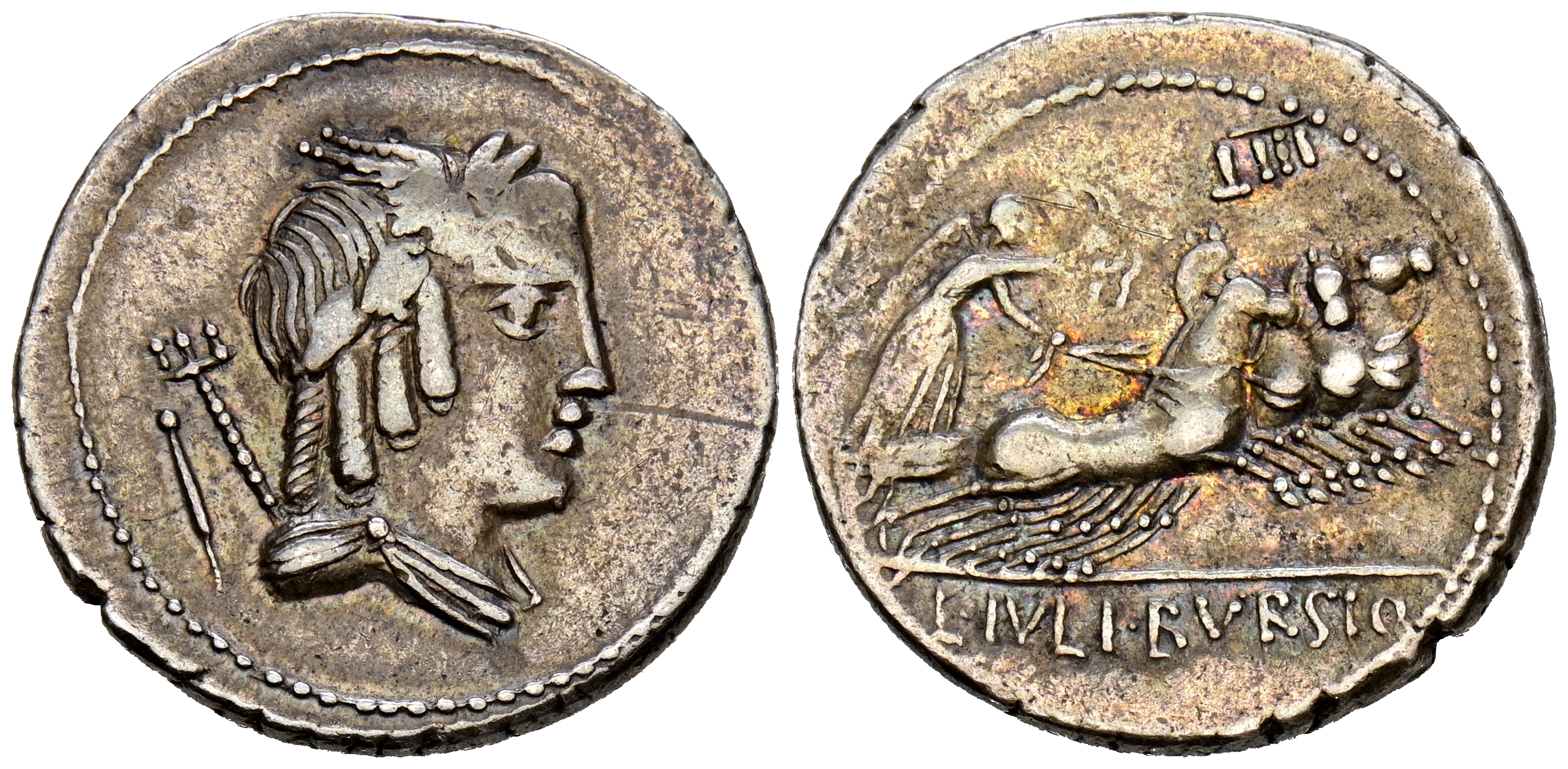 GENS JULIA. Denario. (Ar. 4,04g/21mm). 85 a.C. Taller auxiliar de Roma. (FFC 767; Crawford 352/1a). Anv: Cabeza laureada y alada de Apolo a derecha, detrás tridente y símbolo. Rev: Victoria con corona de laurel en cuádriga a derecha, encima: IIII, en exergo: L IVLI BVRSIO. MBC. Atractivo tono.