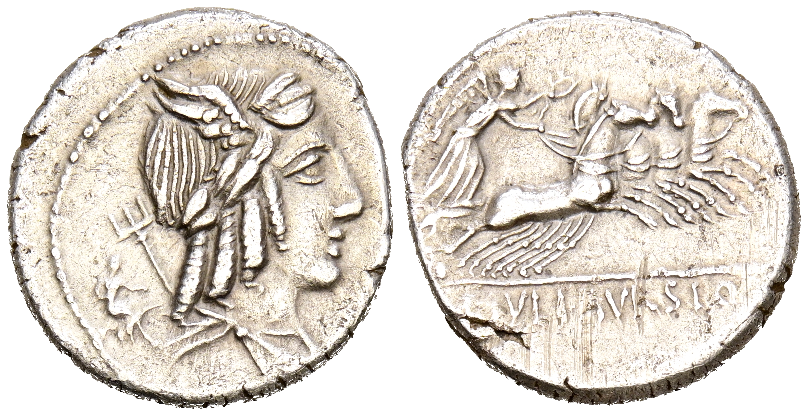 GENS JULIA. Denario. (Ar. 3,49g/19mm). 85 a.C. Taller auxiliar de Roma. (FFC 767; Crawford 352/1a). Anv: Cabeza laureada y alada de Apolo a derecha, detrás tridente y símbolo. Rev: Victoria con corona de laurel en cuádriga a derecha, en exergo: L IVLI BVRSIO. MBC.