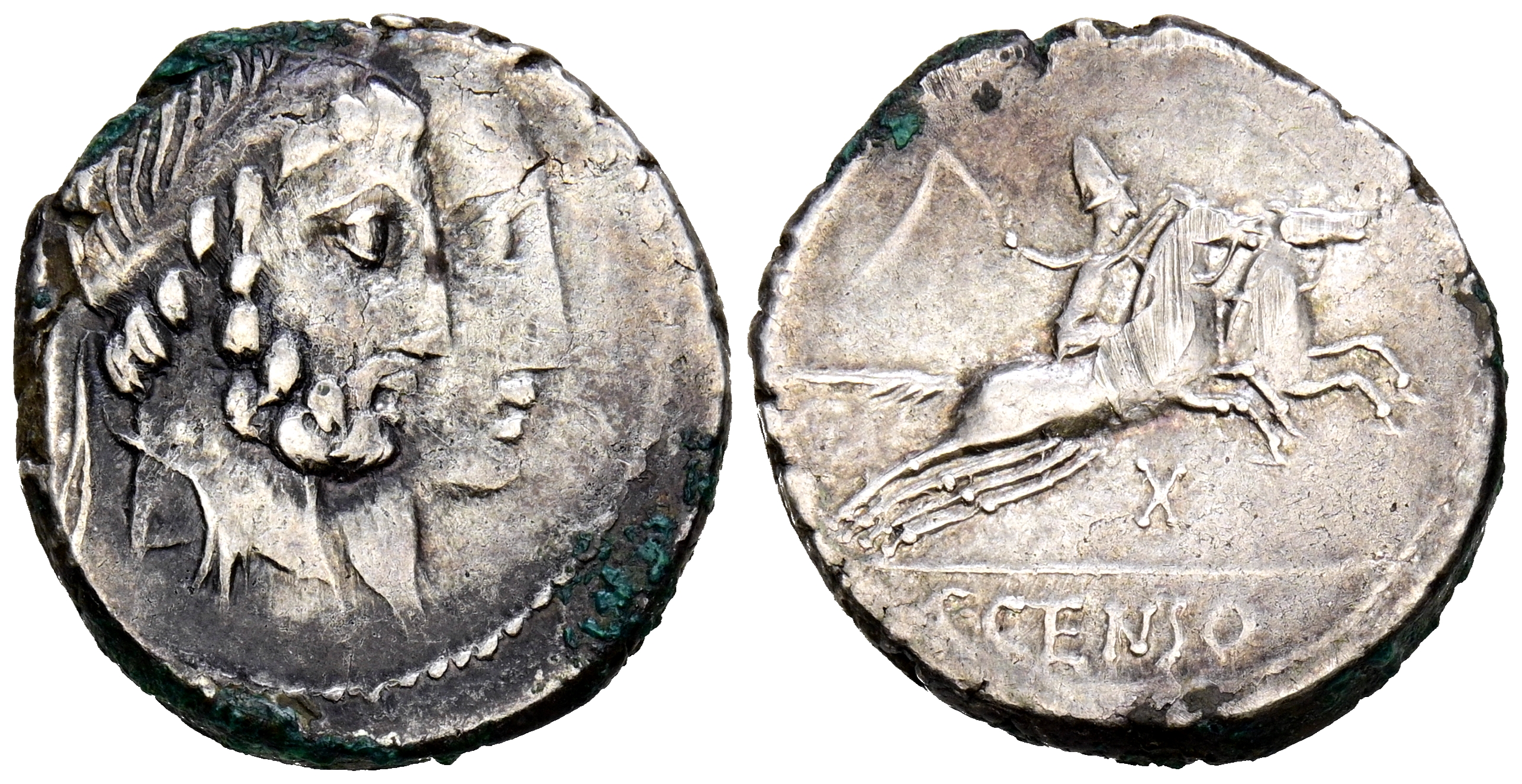 GENS MARCIA. Denario. (Ar. 4,00g/19mm). 88 a.C. Ceca incierta. (FFC 856; Crawford 346/1f). Anv: Cabezas diademadas y yuxapuestas de Numa Pompilius y Ancus Marcius a derecha. Rev: Jinete a caballo con látigo y conduciendo otro caballo a derecha, debajo X, en exergo: C CENSO. MBC. Verdín.