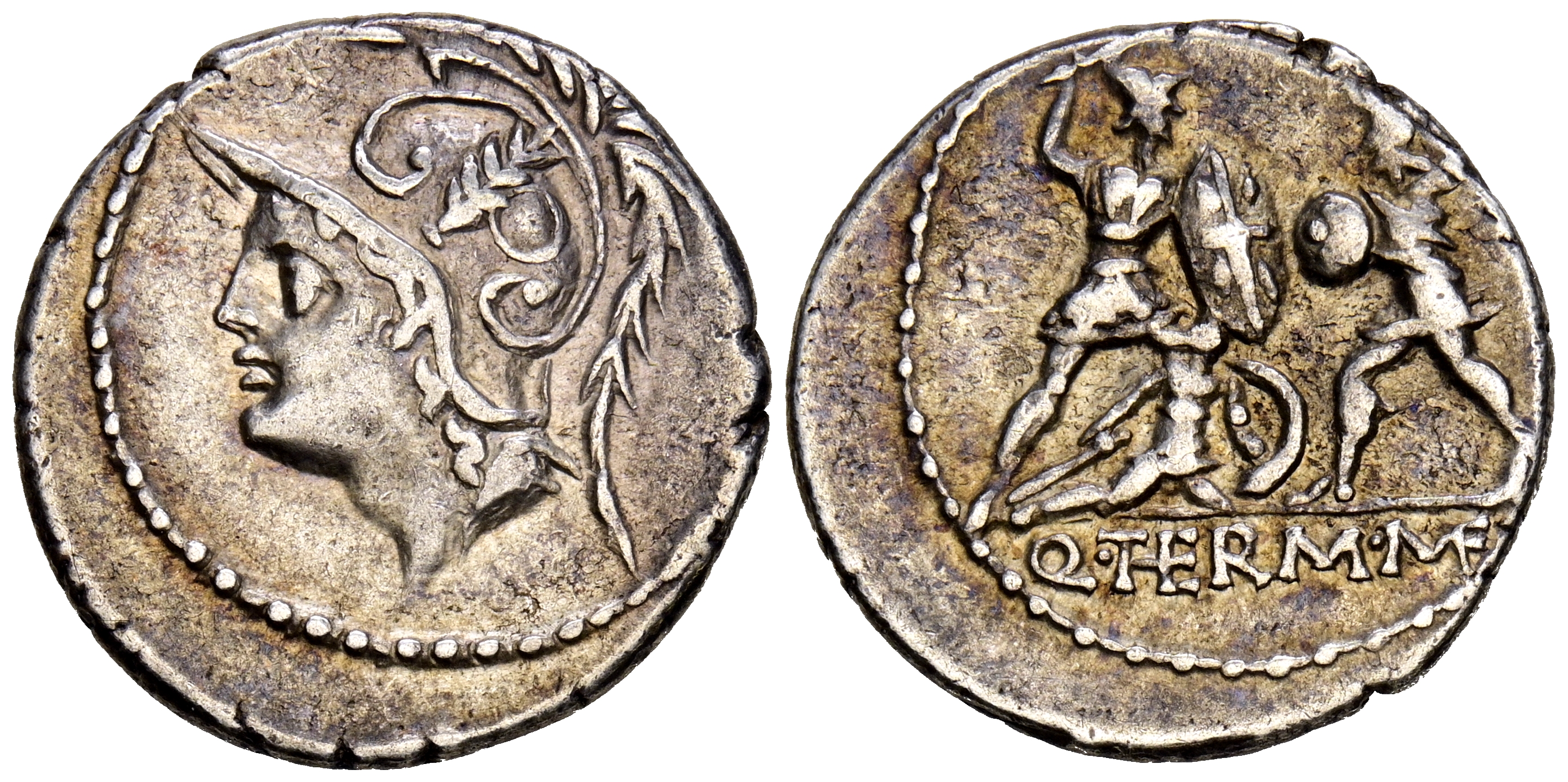 GENS MINUCIA. Denario. (Ar. 3,87g/20mm). 103 a.C. Roma. (FFC 928; Crawford 319/1). Anv: Cabeza de Marte a izquierda. Rev: Dos soldados luchando entre ellos, otro caído en el suelo, en exergo: Q THERM MF. MBC+. Pátina.