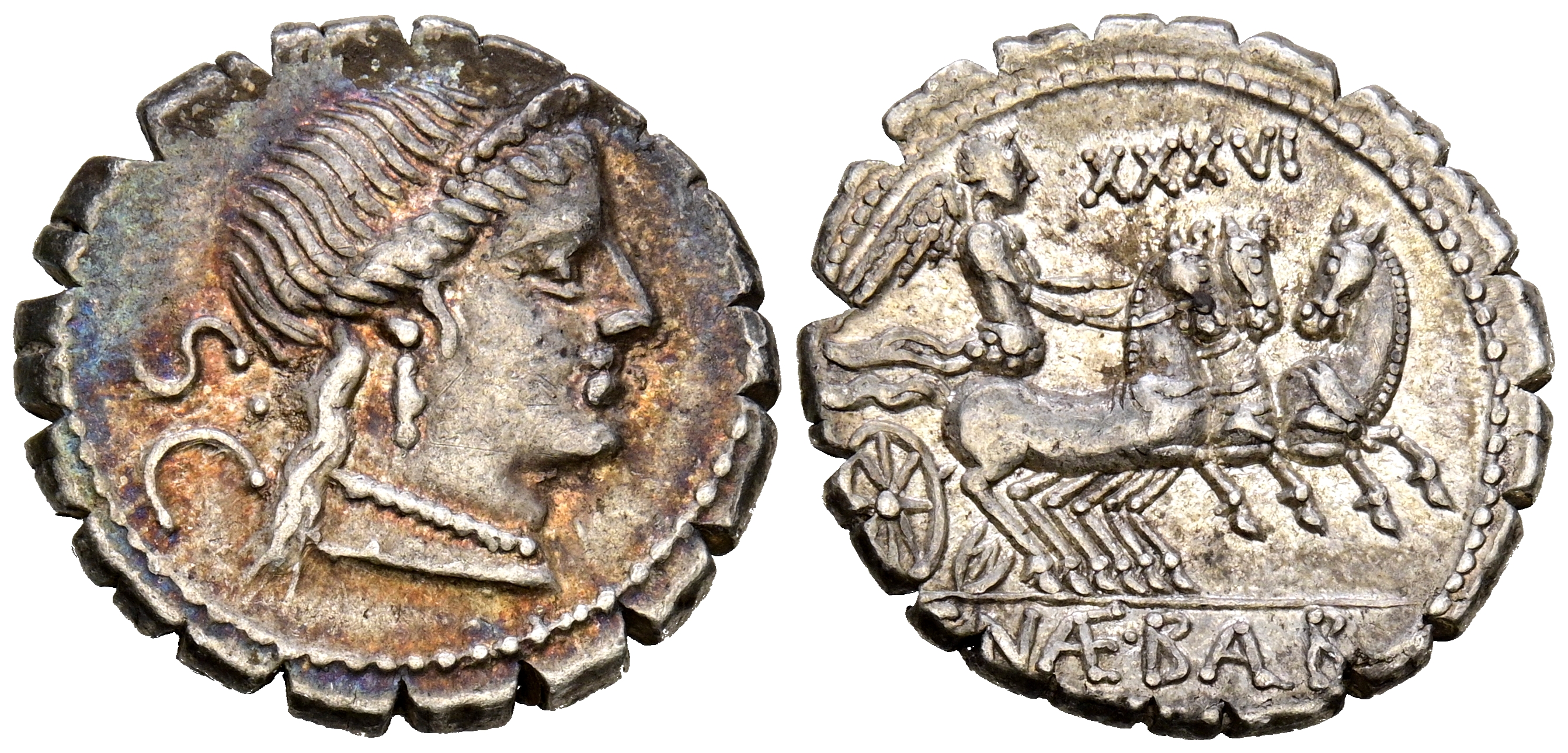 GENS NAEVIA. Denario. (Ar. 4,07g/19mm). 79 a.C. Taller auxiliar de Roma. (FFC 937; Crawford 382/1). Anv: Cabeza diademada de Venus a derecha, detrás SC. Rev: Victoria conduciendo triga a derecha, encima: XXXVI, en exergo: C NAE BALB. EBC-. Bonito ejemplar con tono irisado y restos de brillo original.