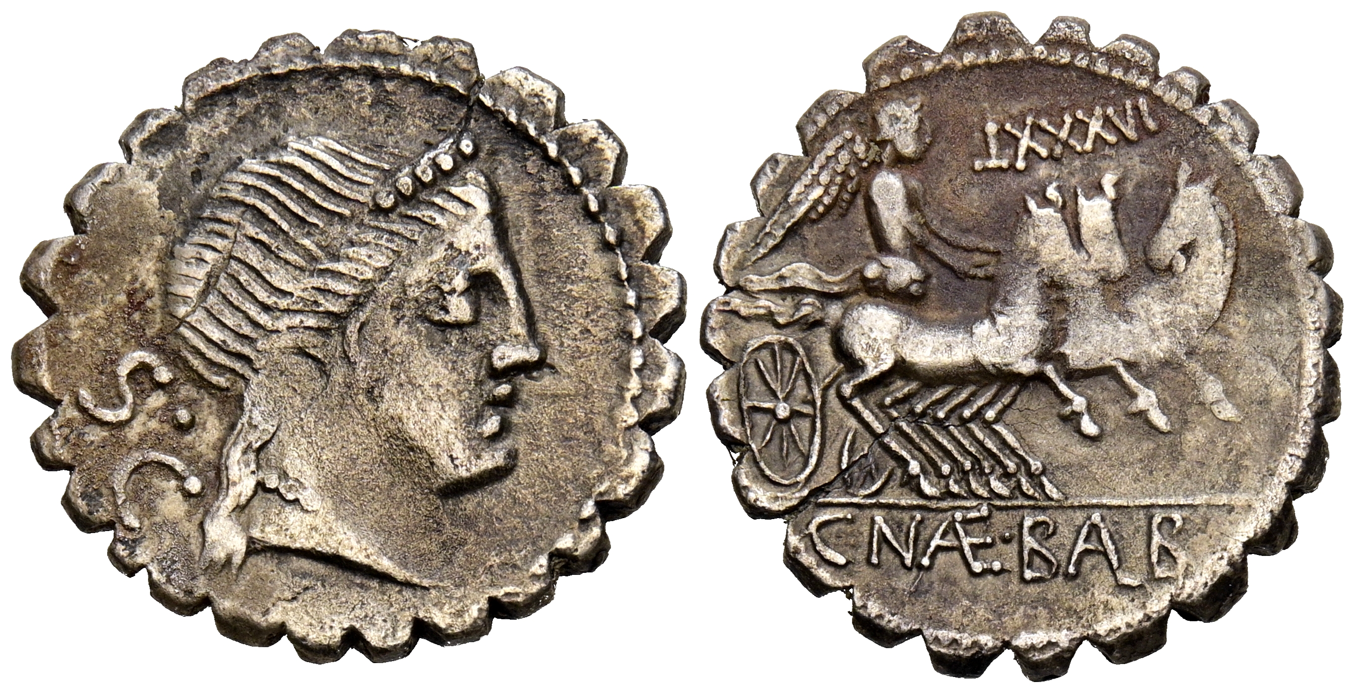 GENS NAEVIA. Denario. (Ar. 3,61g/19mm). 79 a.C. Taller auxiliar de Roma. (FFC 937; Crawford 382/1). Anv: Cabeza diademada de Venus a derecha, detrás SC. Rev: Victoria conduciendo triga a derecha, encima: XXVIIII, en exergo: C NAE BALB. MBC.