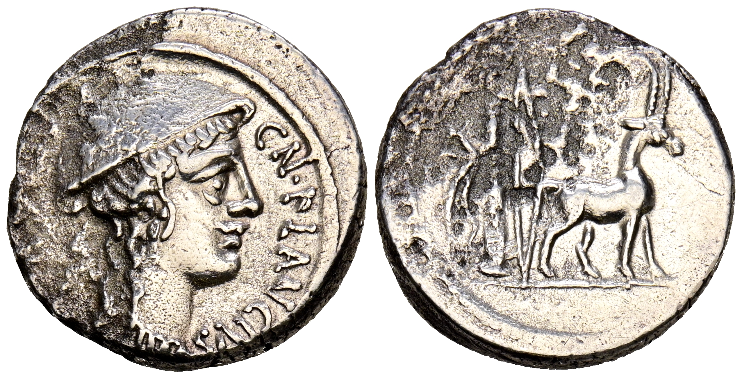 GENS PLANCIA. Denario. (Ar. 3,72g/18mm). 55 a.C. Roma. (FFC 991; Crawford 432/1). Anv: Cabeza de Diana Planciana a derecha, alrededor leyenda: CN PLANCIVS AED CVR SC. Rev: Cabra a derecha, detrás carcaj y arco. MBC. Oxidaciones limpiadas.