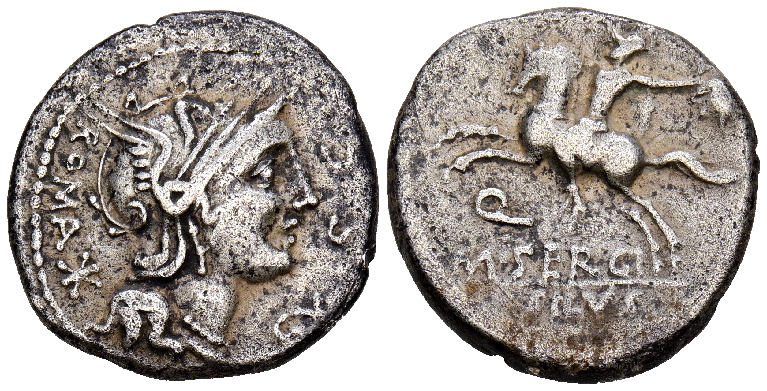 GENS SERGIA. Denario. (Ar. 3,77g/18mm). 116-115 a.C. Norte de Italia. (FFC 1111; Crawford 286/1). Anv: Cabeza de Roma a derecha, detrás estrella y leyenda: ROMA, delante: EX SC. Rev: Jinete con espada a izquierda en el campo cabeza de galo, debajo leyenda: Q M SERGI, en exergo: SILVS. MBC.