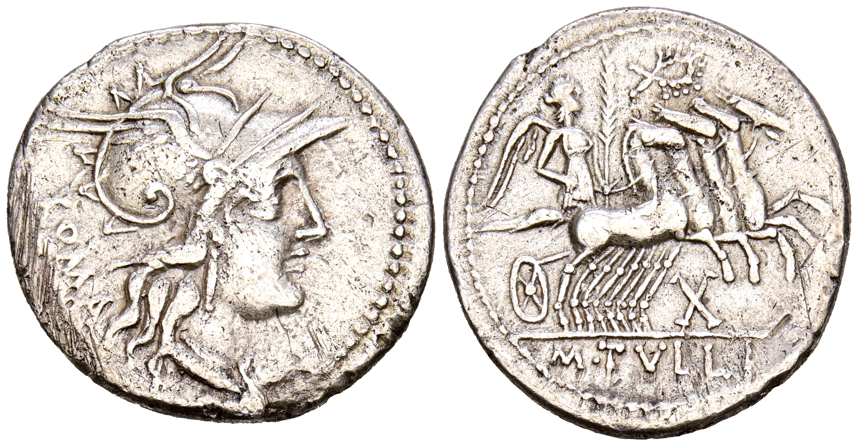 GENS TULLIA. Denario. (Ar. 3,71g/21mm). 120 a.C. Roma. (FFC 1162; Crawford 280/1). Anv: Cabeza de Roma con casco a derecha, detrás leyenda: ROMA. Rev: Victoria portando palma y conduciendo cuádriga a derecha, encima corona de laurel, debajo: X, en exergo: M TVLLI. MBC-.