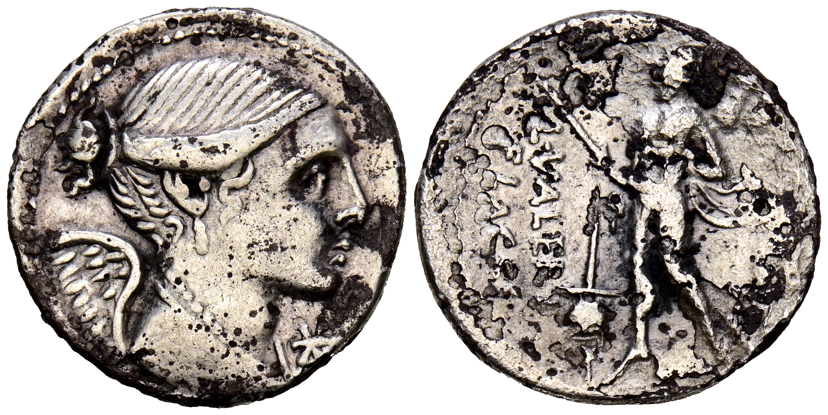 GENS VALERIA. Denario. (Ar. 3,57g/19mm). 108-107 a.C. Sur de Italia. (FFC 1165; Crawford 306/1). Anv: Busto alado de la Victoria a derecha, delante estrella. Rev: Marte avanzando a izquierda portando trofeo y labza a izquierda, delante gorro flamen y detrás espiga, en campo leyenda: L VALERI/FLACCI. MBC/MBC-. Oxidaciones limpiadas.