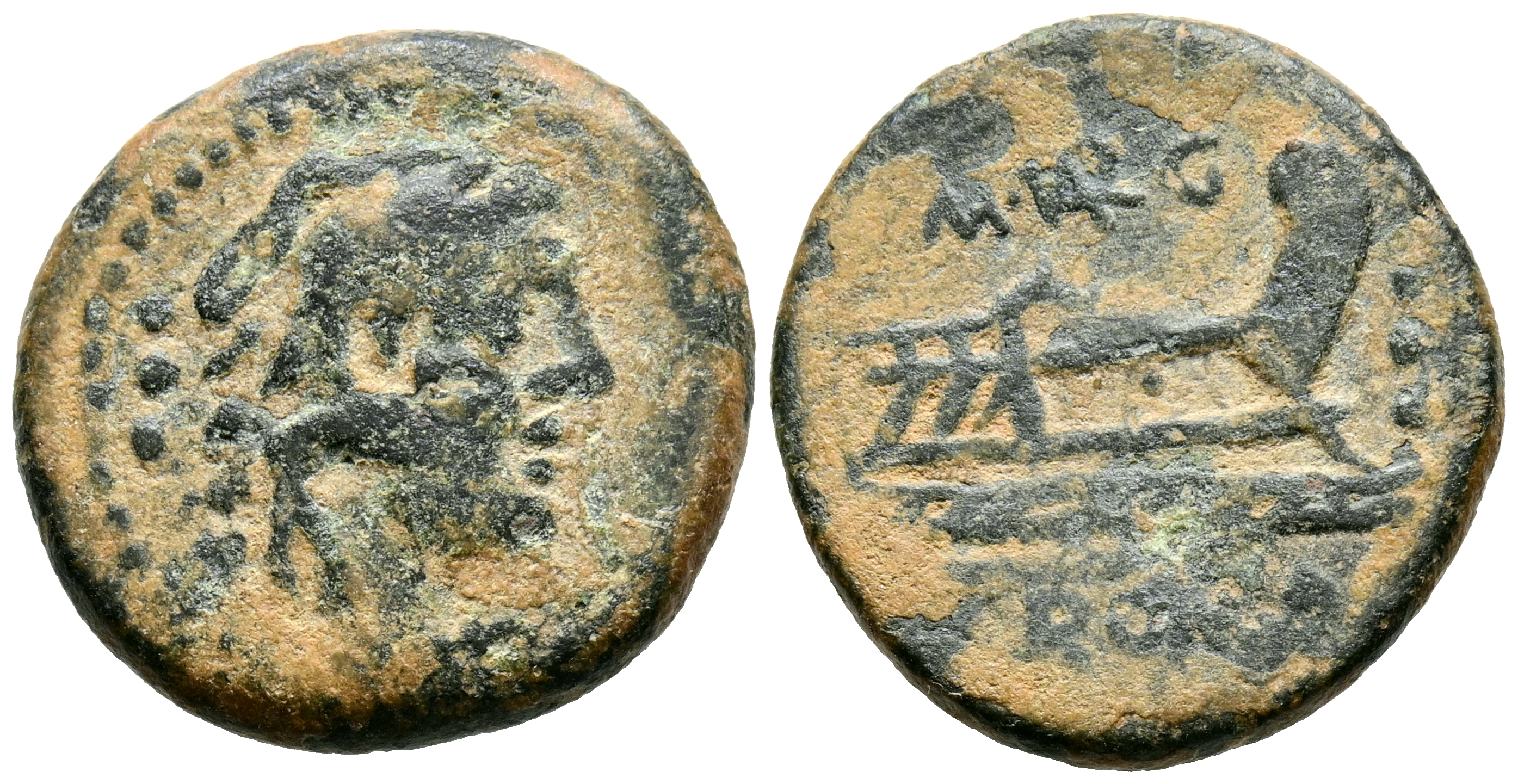 GENS VARGUNTEIA. Cuadrante. (Ae. 4,99g/20mm). 130 a.C. Roma. (Crawford 257/4). Anv: Cabeza de Hércules con piel de león a derecha, detrás tres puntos. Rev: Proa a derecha, encima: M VARG, debajo: ROMA, delante: tres puntos. MBC.