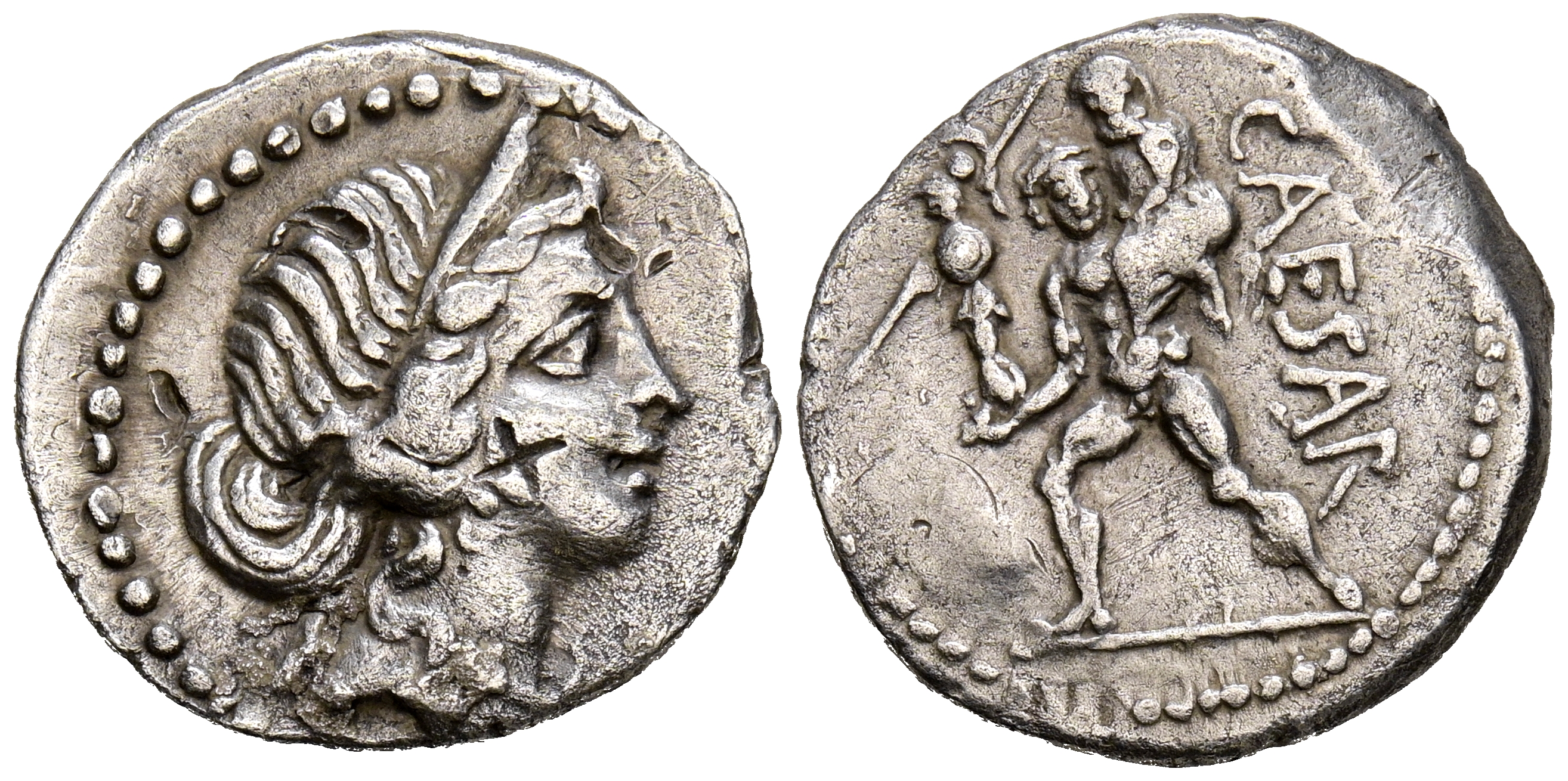 JULIO CESAR. Denario. (Ar. 3,18g/18mm). 47-46 a.C. Ceca militar móvil en el Norte de Africa. (FFC 10; Crawford 458/1). Anv: Cabeza diademada de Venus a derecha. Rev: Aenas avanzando a izquierda llevando en brazos a Anchises y palladium, detrás leyenda: CAESAR. MBC. Limpiado. Contramarcas en anverso.