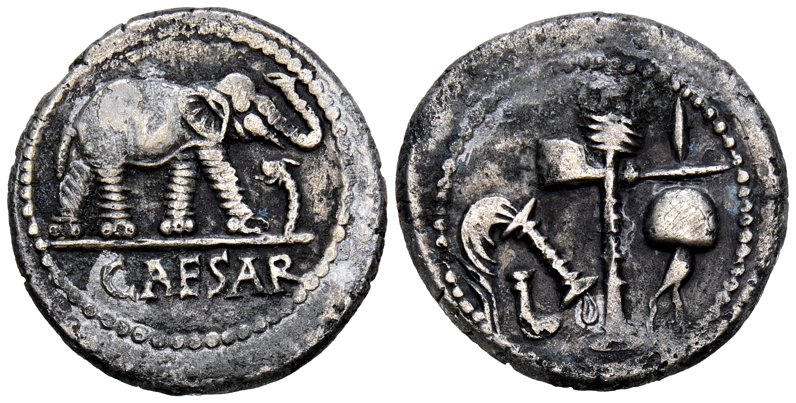 JULIO CESAR. Denario. (Ar. 3,07g/18mm). 49-48 a.C. Ceca militar móvil. (FFC 50; Crawford 443/1). Anv: Elefante avanzando a derecha, delante serpiente, debajo leyenda: CAESAR. Rev: Emblemas del pontificado: simpulum, aspergilum, securis (coronado por carbeza de lobo) y apex. MBC-. Escaso ejemplar.