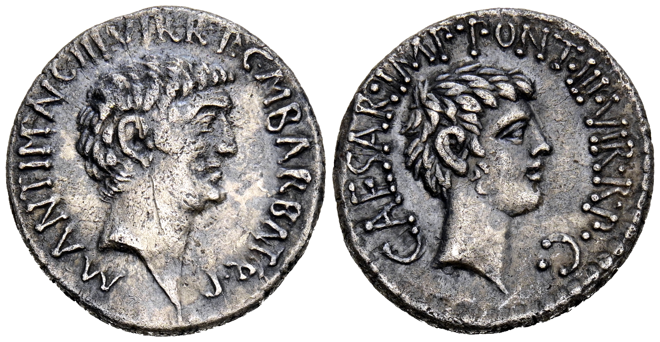 MARCO ANTONIO y OCTAVIO. Denario. (Ar. 3,65g/19mm). 41 a.C. Ceca volante. (FFC 8; Crawford 517/2). Anv: Cabeza de Marco Antonio a derecha, alrededor leyenda: M ANT IMP AVG III VIR RPCM BARBAT QP. Rev: Cabeza de Octavio a derecha, alrededo leyenda: CAESAR IMP PONT III VIR RPC. MBC/MBC+. Escaso ejemplar.
