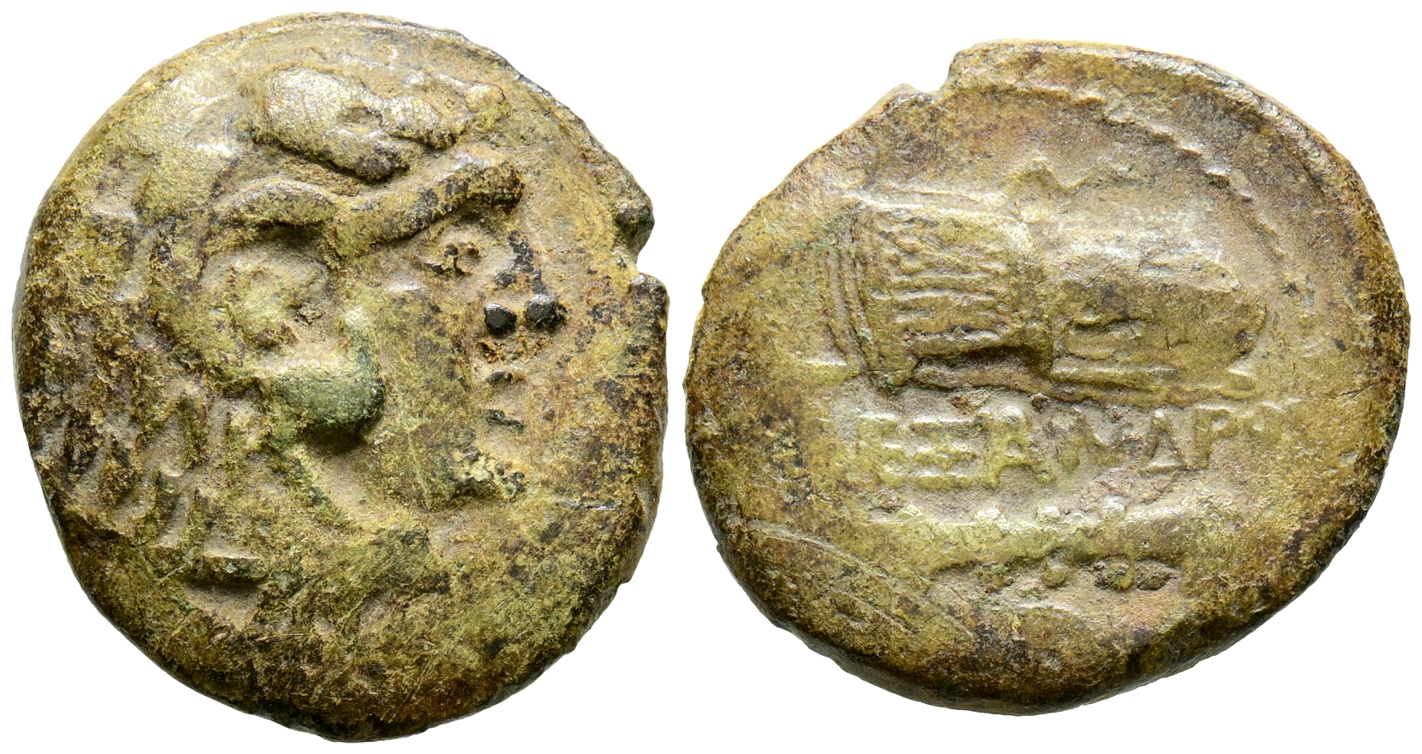 REYES DE MACEDONIA, Alejandro III el Grande. Ae21. (Ae. 6,02g/21mm). 336-323 a.C. Ceca incierta. (Price 266; HGC 3.1, 925a). Anv: Cabeza de Hércules con piel de león a derecha. Rev: Leyenda griega: AΛΕΞΑΝΔΡOY, entre mazo y arco con carcaj. MBC.