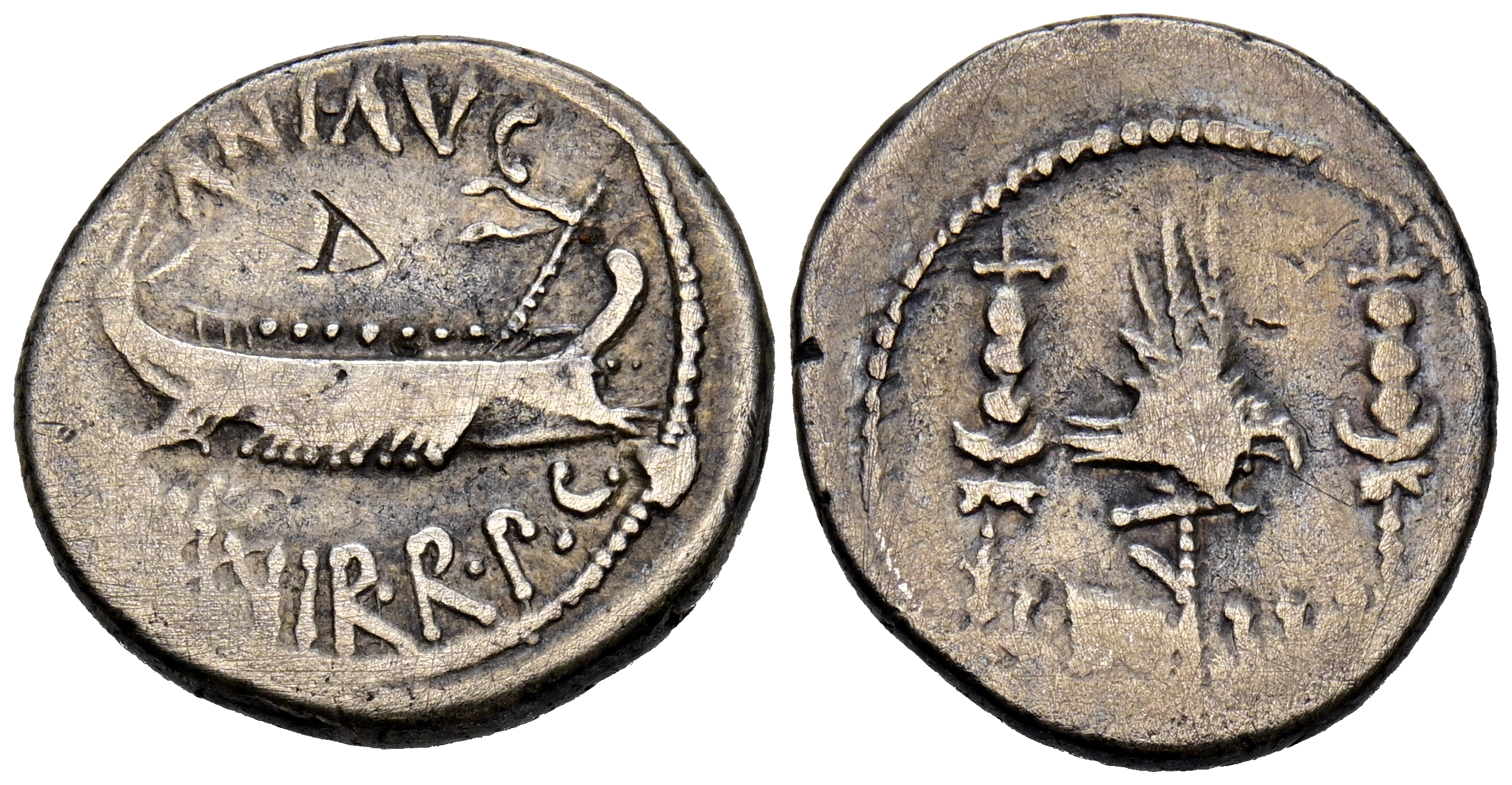 MARCO ANTONIO. Denario. (Ar. 3,53g/18mm). 32-31 a.C. Ceca volante. (FFC 33; Crawford 544/15). Anv: Galera Pretoriana a derecha, alrededor leyenda: ANT AVG III VIR RPC. Rev: Aguila legionaria entre dos estandartes, entre ellas: LEG-III. MBC-. Contramarca en anverso.