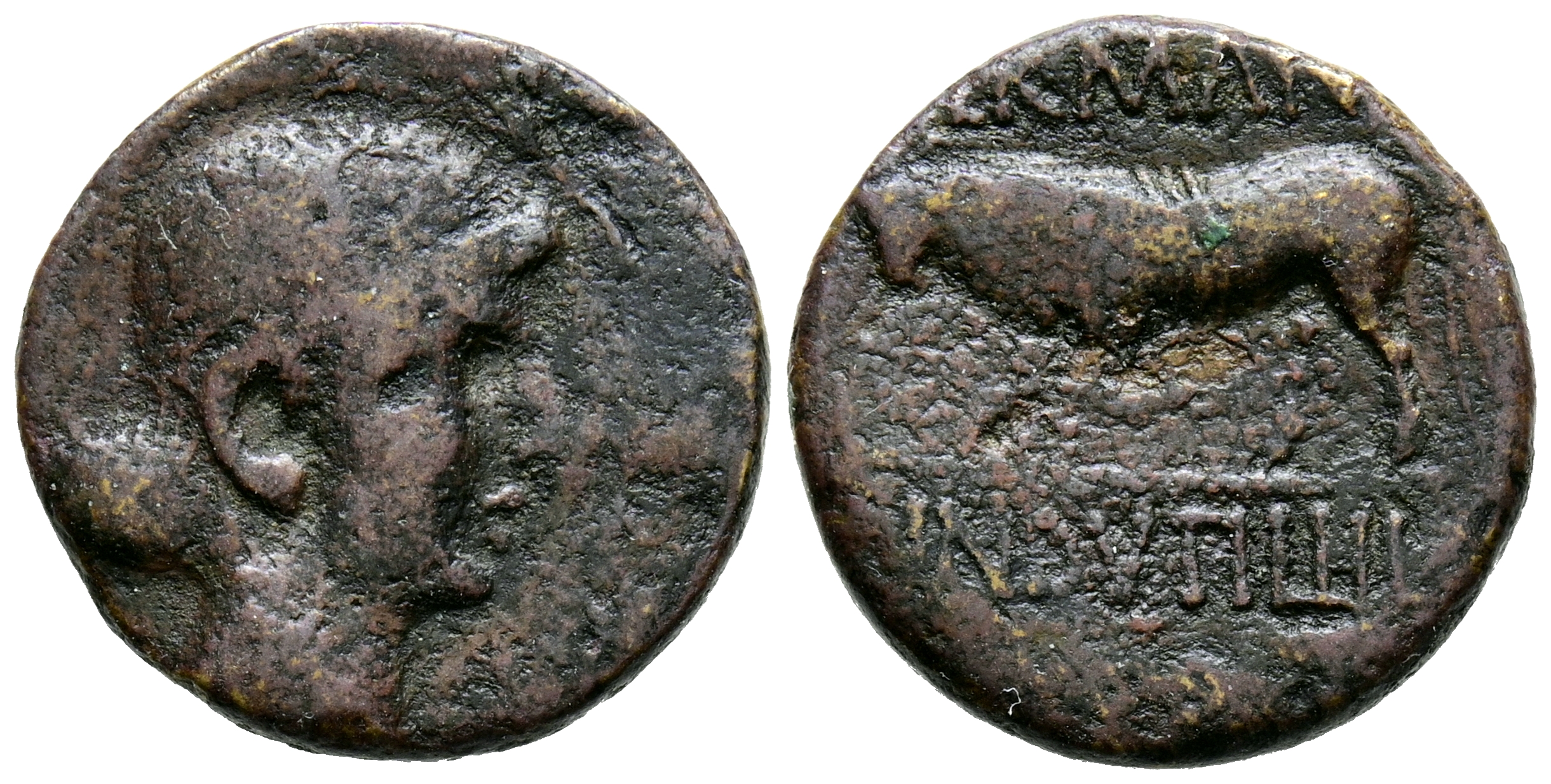 AUGUSTO. Semis. (Ae. 3,08g/17mm). 10 a.C. Ceca incierta de Germanus Indutilli en la Galia. (RPC 506; RIC 249). Anv: Cabeza masculina diademada a derecha. Rev: Toro embistiendo a izquierda, encima: GERMANVS, en exergo: INDVTILLI. MBC-.