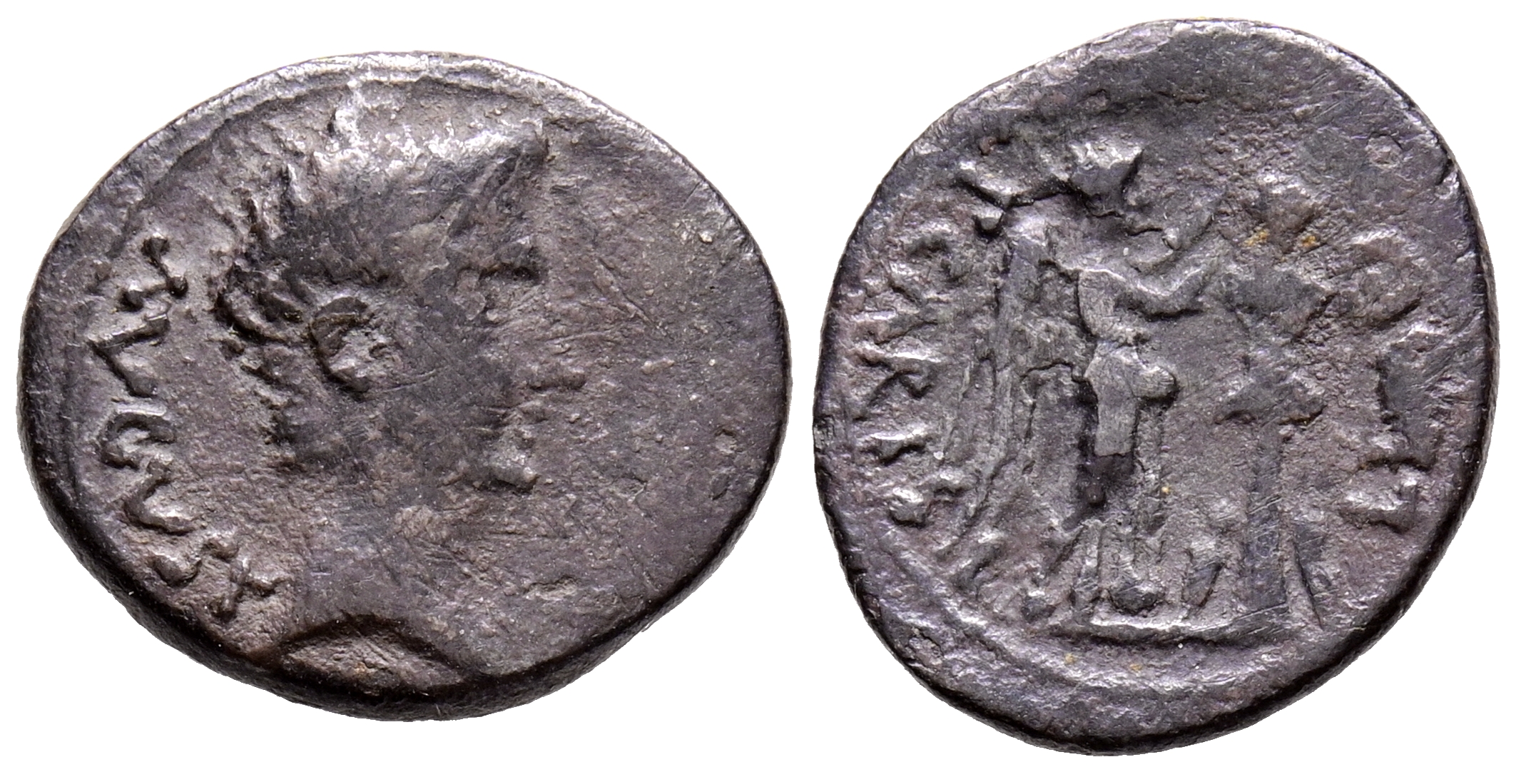 AUGUSTO. Quinario. (Ar. 1,60g/15mm). 25-23 a.C. Emérita Augusta. (RIC 1a). Anv: Cabeza de Augusto a derecha, detrás leyenda: AVGVSTVS. Rev: Victoria estante a derecha coronando trofeo, alrededor leyenda: P CARISI LEG. MBC. Patina oscura.