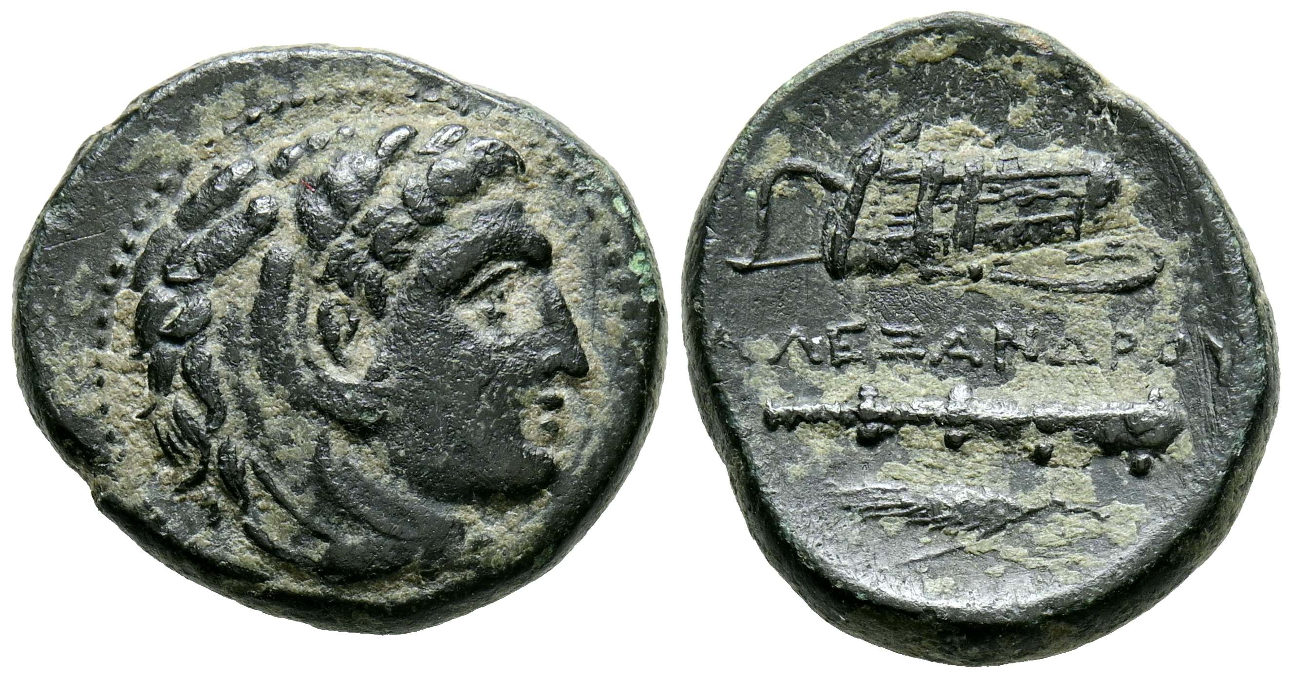 REYES DE MACEDONIA, Alejandro III el Grande. Ae18. (Ae. 5,49g/19mm). 336-323 a.C. Anv: Cabeza de Heracles con piel de león a derecha. Rev: Leyenda griega entre mazo y carcaj. MBC.