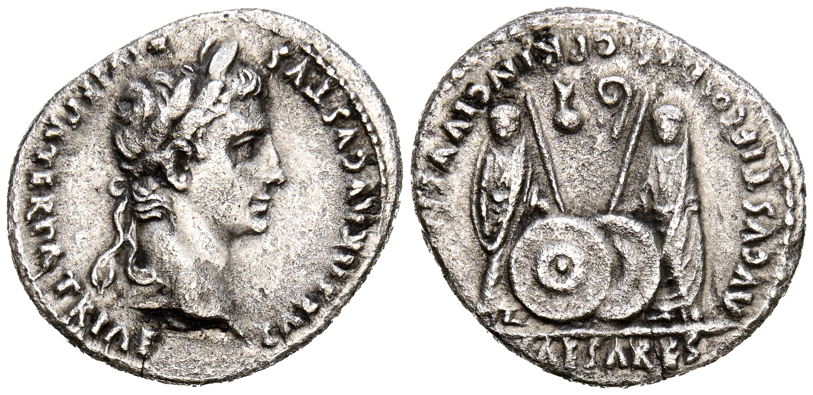 AUGUSTO. Denario. (Ar. 3,29g/20mm). 7-6 a.C. (RIC 207). Anv: Cabeza laureada de Augusto a derecha, alrededor leyenda: CAESAR AVGVSTVS DIVI F PATER PATRIAE. Rev: Cayo y Lucio estantes de frente, entre ellos escudo y lanzas, en campo símpulo y lítuo, en exergo: CL CAESARES, alrededor leyenda: AVGVSTI F COS DESIG PRINC IVVENT. MBC+.