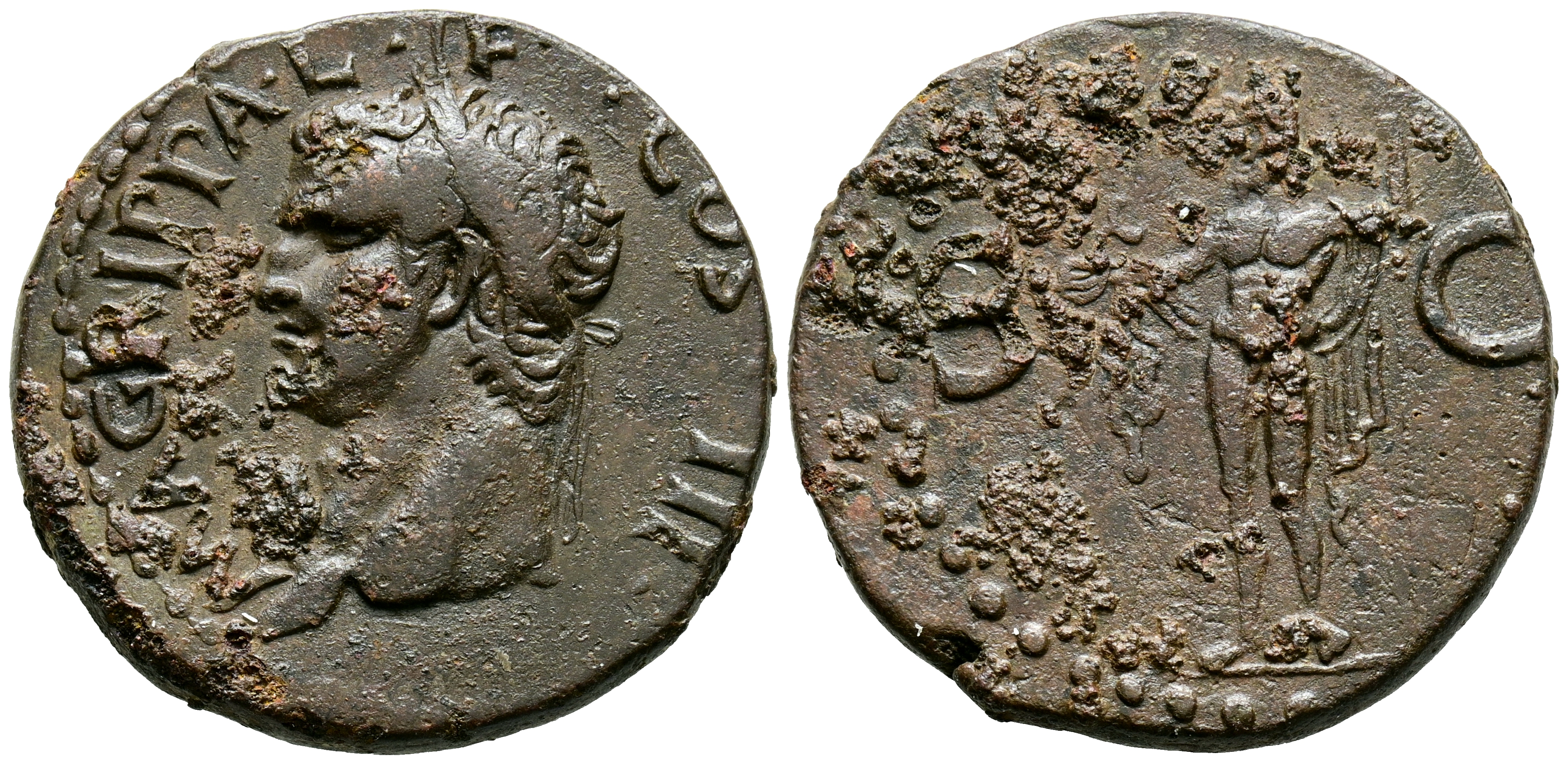 AGRIPA. As. (Ae.11,60g/27mm). 37-41 D.C. Roma. (RIC 58). Anv: Cabeza laureada de de Agripa, alrededor leyenda: M AGRIPPA L F COS III. Rev: Neptuno estante a izquierda portando tridente y delfín sosteniendo manto, en campo S-C. MBC+. Concreciones.