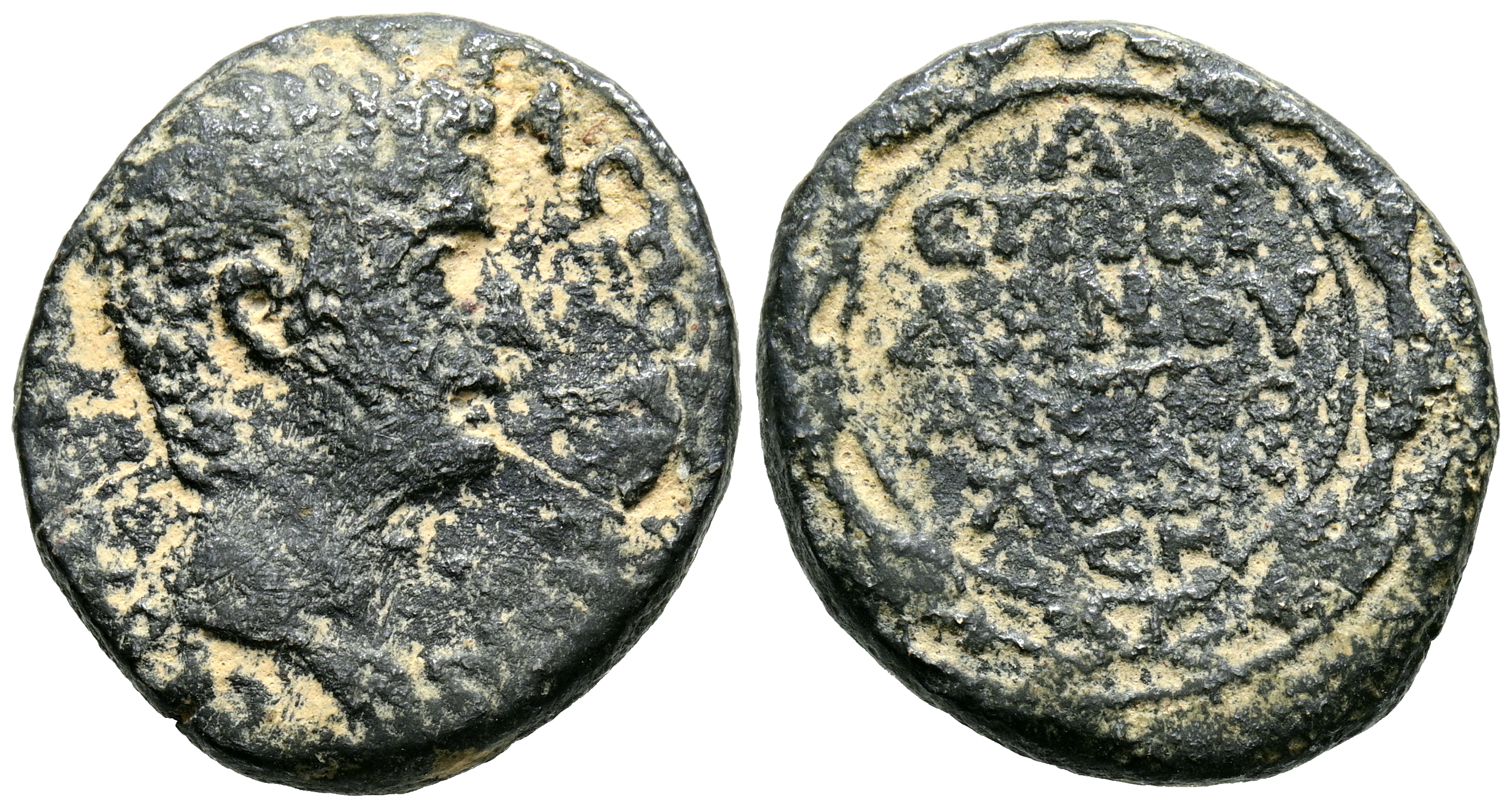 TIBERIO. Semis. (Ae. 7,38g/20mm). 14-15 d.C. Antioquía, Siria. (RPC 4271) Anv: Cabeza de Tiberio a derecha, alrededor leyenda: CEBACTOC CEBACTOY KAICAΡ. Rev: Leyenda en seis líneas dentro de corona de laurel: A-EΠI ΣI-ΛANOY-ANTIO-XEΩN-EM. BC+.