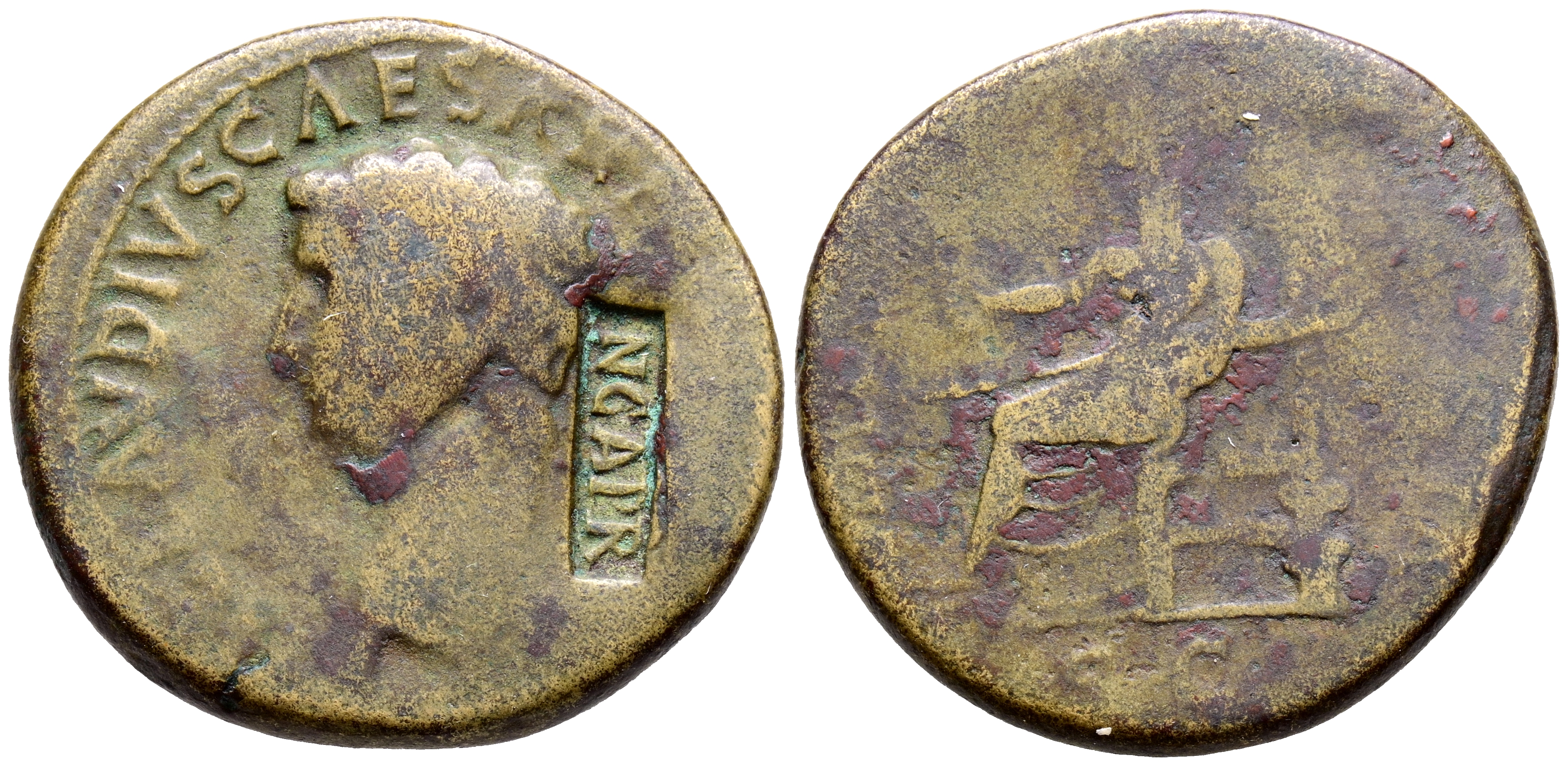 CLAUDIO I. As. (Ae. 11,54g/28mm). 41-50 d.C. Roma. (RIC 94). Anv: Busto desnudo de Claudio I a izquierda, alrededor leyenda: TI CLAVDIVS CAESAR AVG P M TR P IMP. Rev: Ceres sentada a derecha sosteniendo espiga y antorcha, en exergo: SC, alrededor leyenda: CERES AVGVSTI. BC. Contamarca NCAPR (Nummus Caesare Augusto PRobatus) en anverso.