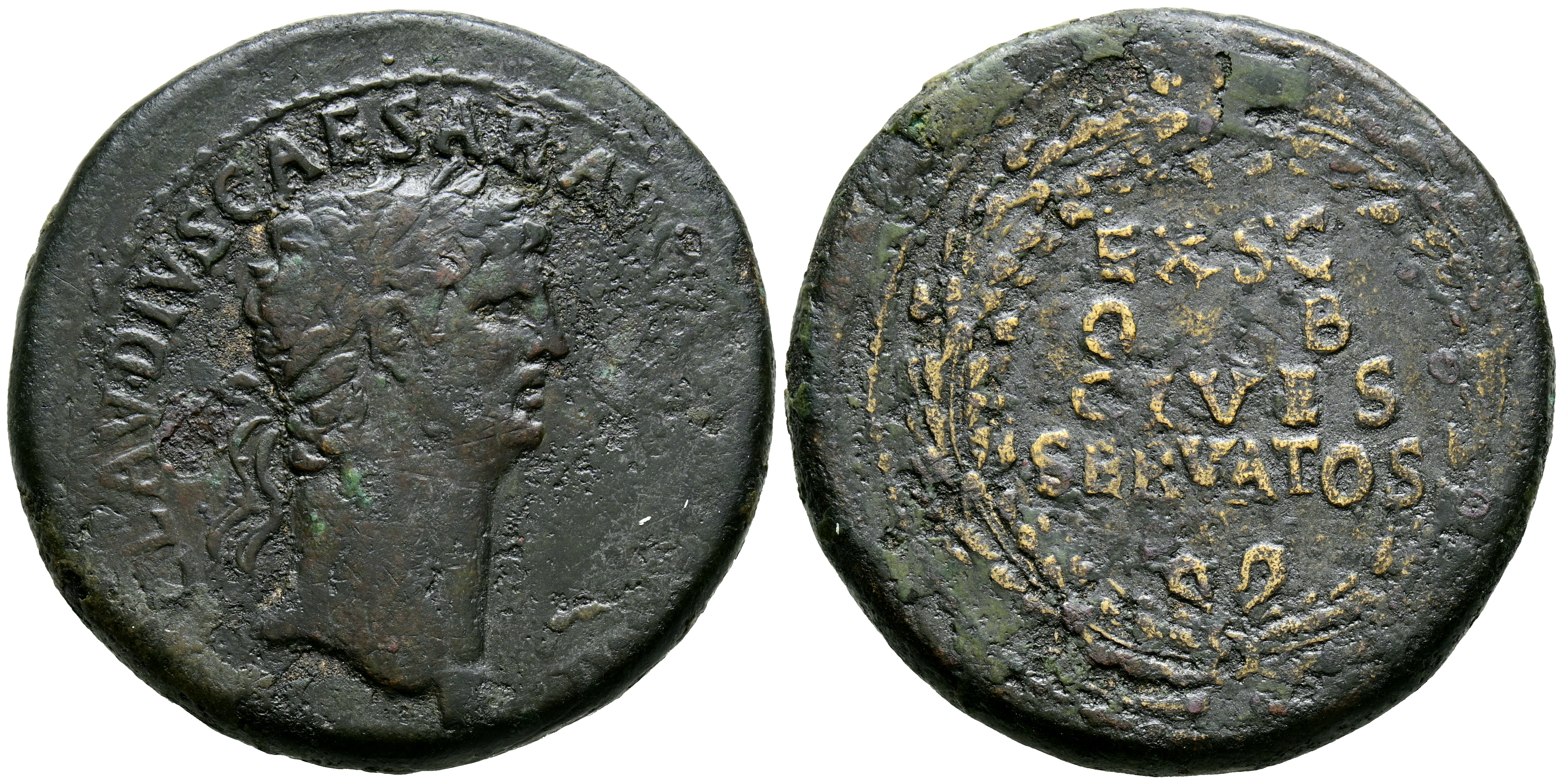 CLAUDIO. Sestercio. (Ae. 26,40g/35mm). 41-50 d.C. Roma. (RIC 96). Anv: Busto laureado de Claudio a derecha, alrededor leyenda: TI CLAVDIVS CAESAR AVG P M TR P IMP. Rev: EX SC OB CIVES SERVATOS dentro de corona de laural. MBC-.