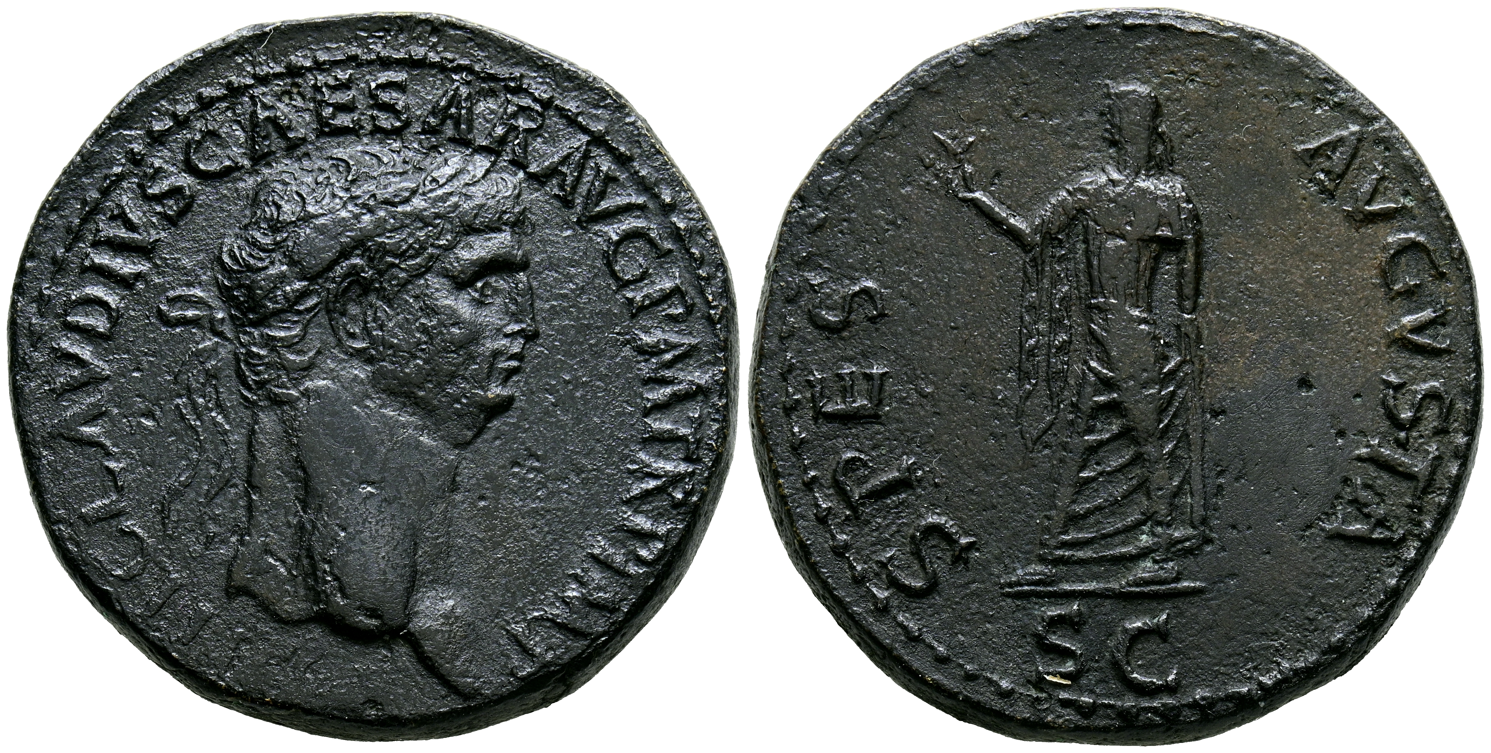 CLAUDIO I. Sestercio. (Ae. 30,53g/36mm). 41-42 d.C. Roma. (RIC 99). Anv: Cabeza laureada de Claudio I a derecha, alrededor leyenda: TI CLAVDIVS CAESAR AVG P M TR P IMP. Rev: Spes avanzando a izquierda portando flor, en exergo: SC, alrededor leyenda: SPES AVGVSTA. MBC. Limpiado mecánicamente.