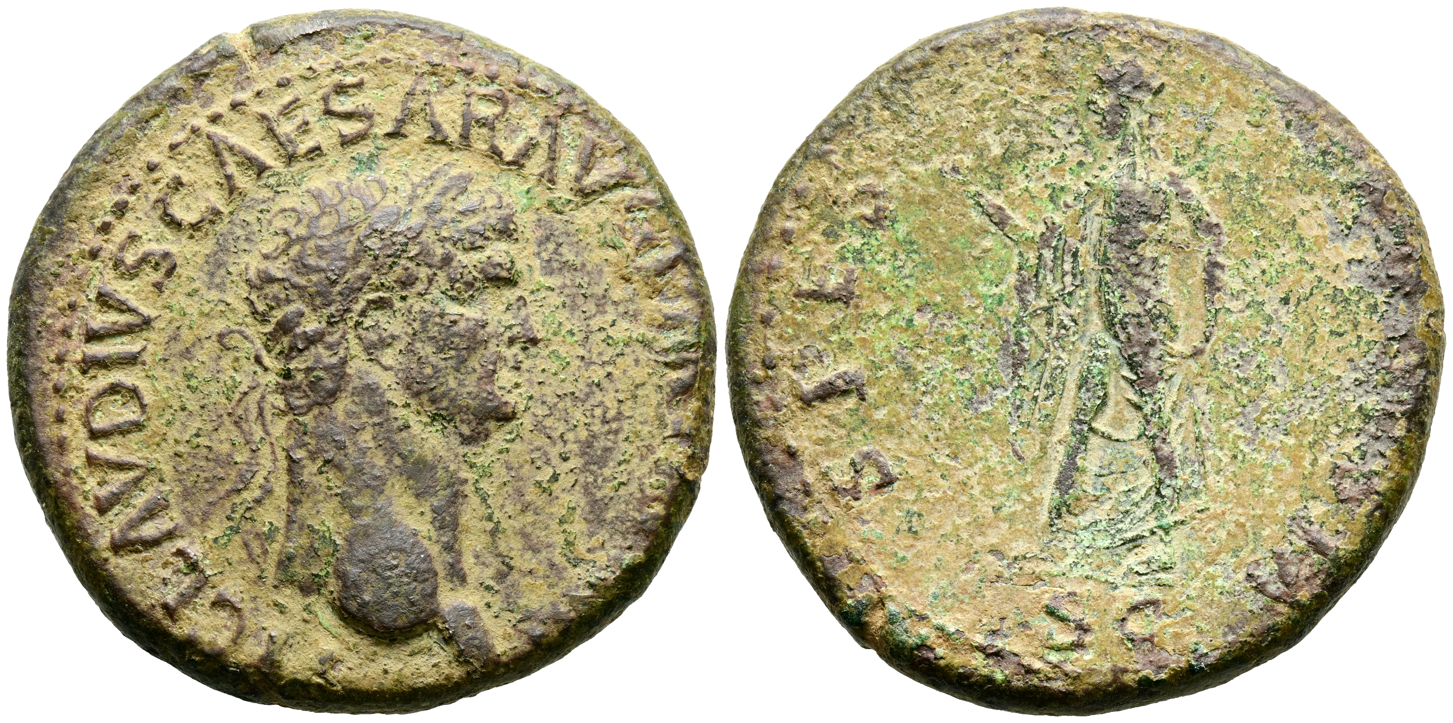 CLAUDIO. Sestercio. (Ae. 26.48g/35mm). 41-42 d.C. Roma. (RIC 115). Anv: Cabeza laureado de Claudio a derecha, alrededor leyenda: TI CLAVDIVS CAESAR AVG P M TR P IMP P P. Rev: Spes avanzando a la izquierda sosteniendo flor y agarrando el vestido, en exergo: S-C, alrededor leyenda: SPES AVGVSTA. MBC/MBC-.