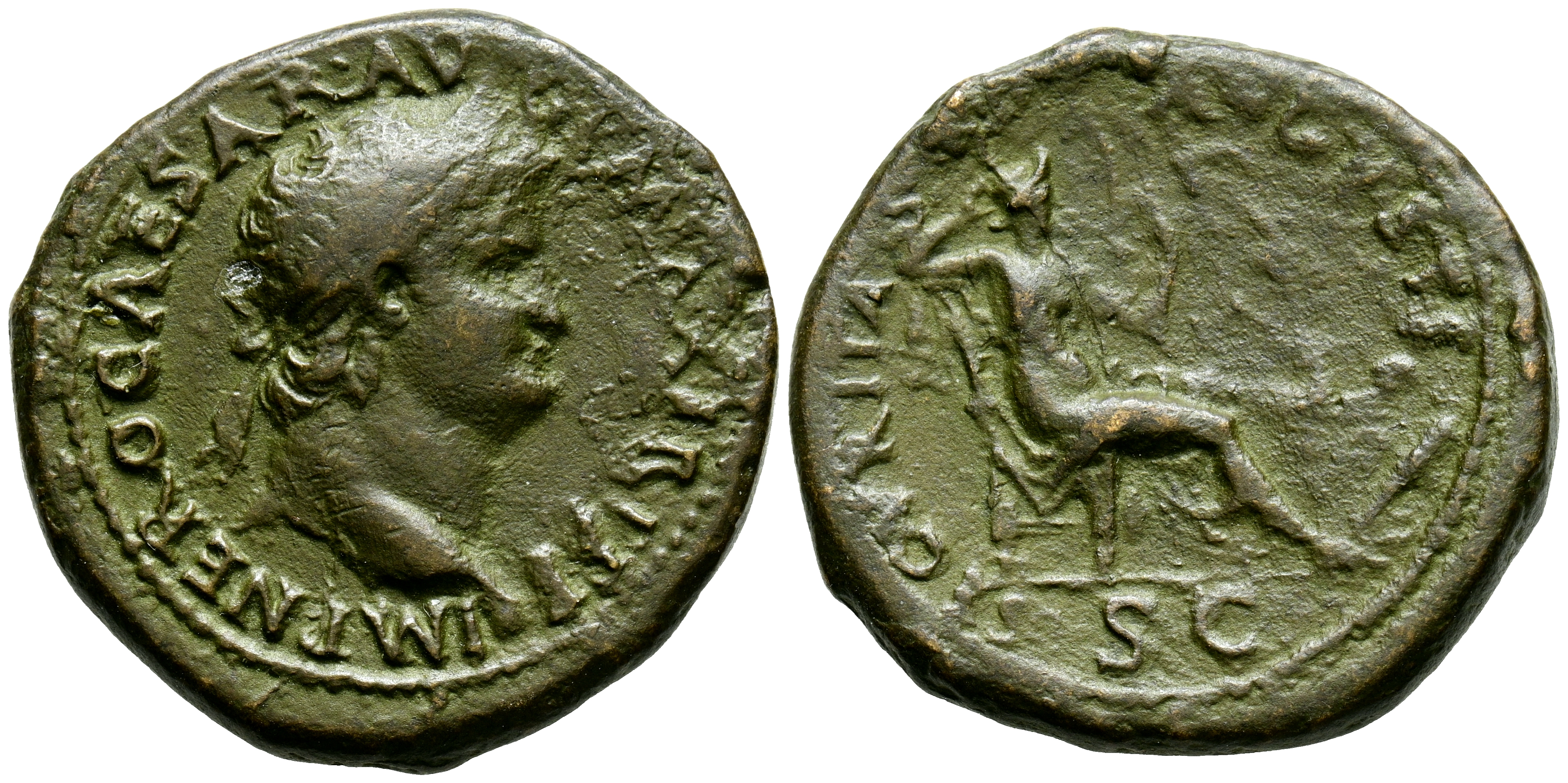 NERON. As. (Ae. 15,03g/30mm). 67 d.C. Lugdunum. (RIC 596). Anv: Cabeza laureada de Nerón a derecha, alrededor leyenda: MIP NERO CAESAR AVG P M TR P P P. Rev: Securitas sentada a derecha portando cetro, delante altar decorado, en exergo: SC, alrededor leyenda: SECVRITAS AVGVSTI. MBC-/BC+.