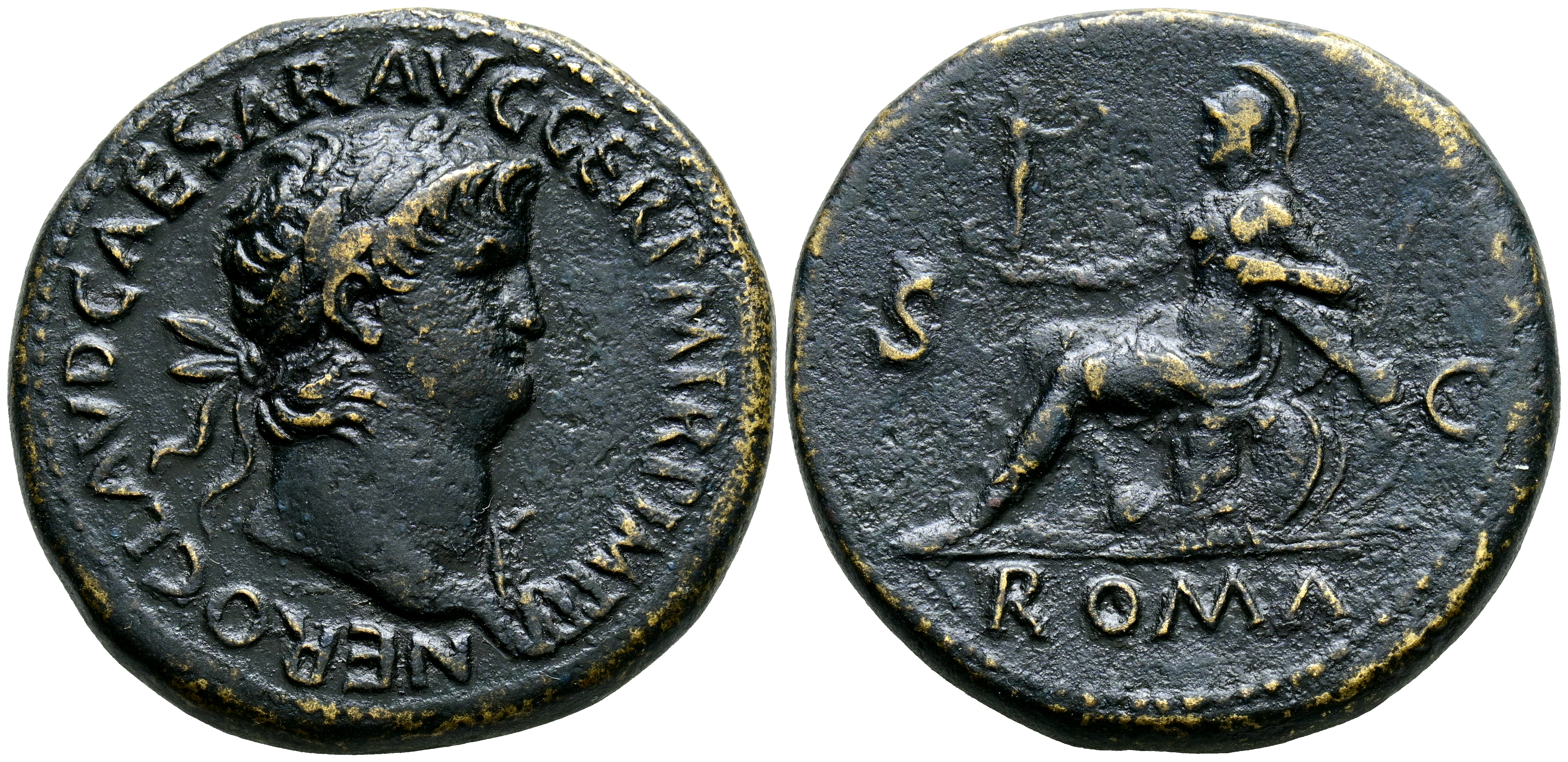 NERÓN. Sestercio. (Ae. 27,57g/35mm). 65 d.C. Roma. (RIC 96). Anv: Busto laureado de Nerón a derecha, alrededor leyenda: NERO CLAVD CAESAR AVG GER P M TR P IMP P P. Rev: Roma sentada a izquierda portando Victoria sobre globo, en campo: SC, en exergo: ROMA. MBC.