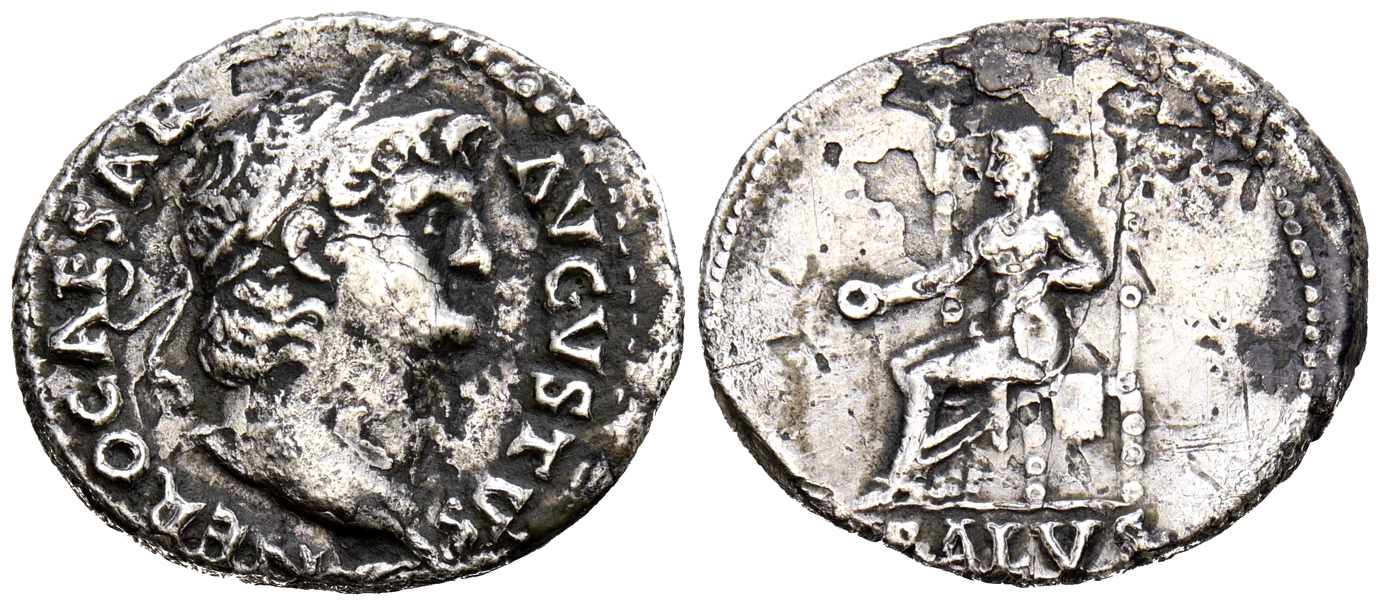 NERON. Denario. (Ar. 3,20g/18mm). 65-66 D.C. Roma. (RIC 60). Anv: Cabeza laureada de Nerón a derecha, alrededor leyenda: NERO CAESAR AVGVSTVS. Rev: Salus sentada a izquierda portando patera, debajo leyenda: SALVS. BC+.
