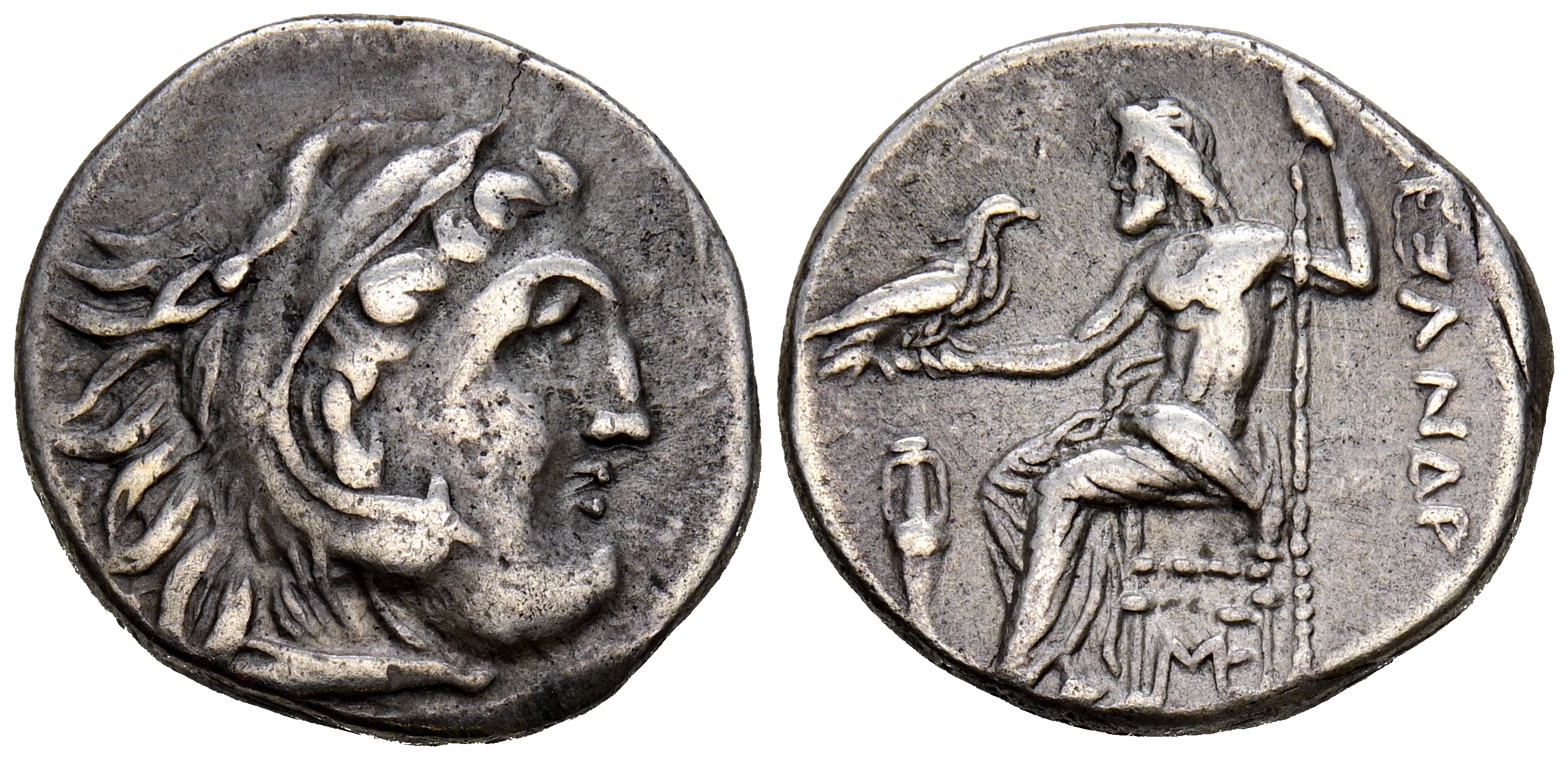 REYES DE MACEDONIA, Alejandro III el Grande. Dracma. (Ar. 4,21g/18mm). 310-323 a.C. Lampsakos. (Price 1417). Anv: Cabeza de Herácles a la derecha, con tocado de piel de león. Rev: Zeus sentado a la izquierda portando cetro y águila, ánfora a izquierd a, debajo del trono monograma ME, detrás leyenda griega: ΑΛΕΞΑΝΔΡΟΥ. MBC.