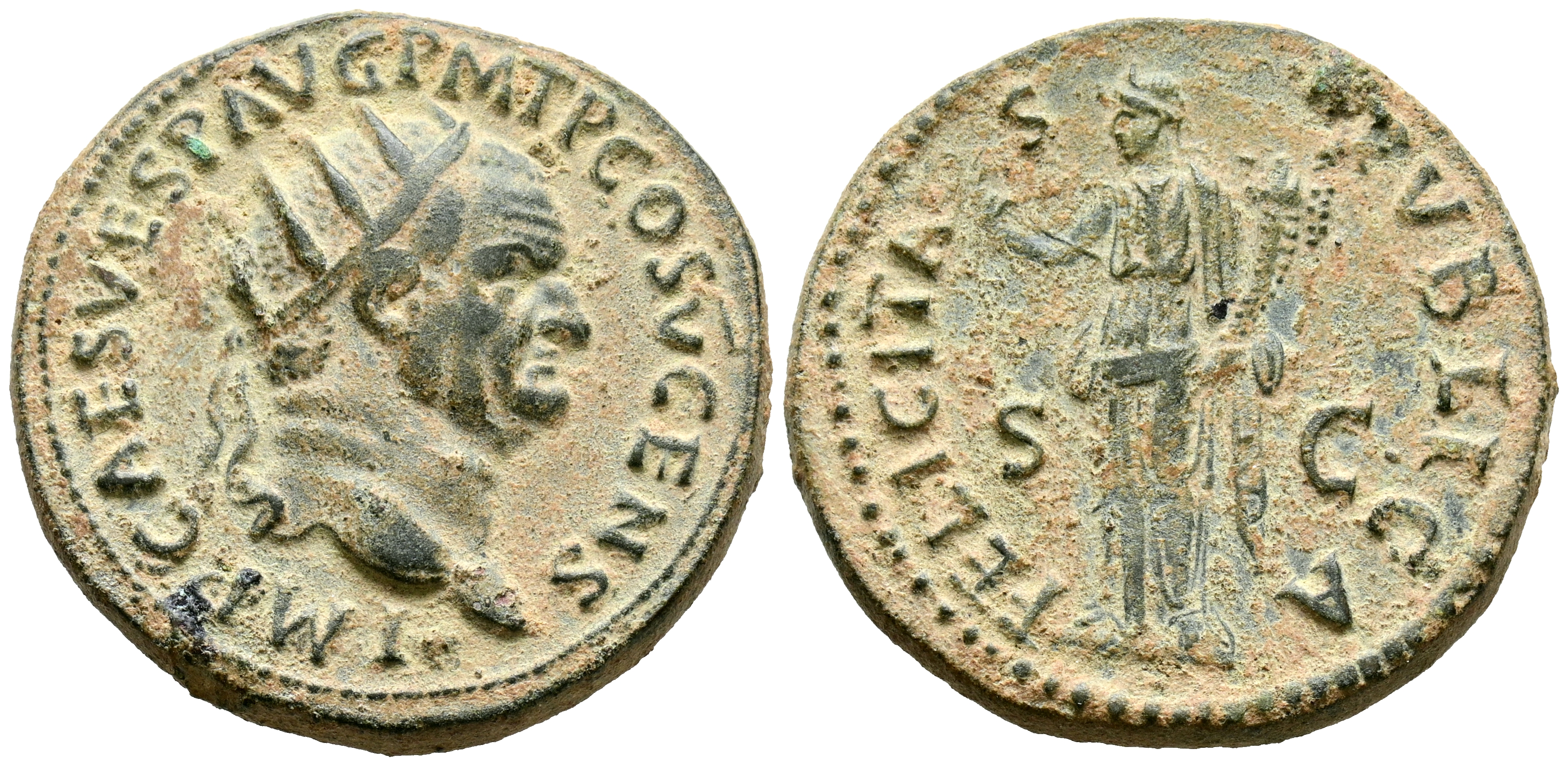 VESPASIANO. Dupondio. (Ae. 12,05g/27mm). 74 d.C. Roma. (RIC 715). Anv: Cabeza radiada de Vespasiano a derecha, alrededor leyenda: IMP CAES VESP AVG P M T P COS V CENS. Rev: Felicitas estante a izquierda portando caduceo y cornucopia, entre S-C, alrededor leyenda: FELICITAS PVBLICA. MBC+. Bonito ejemplar.
