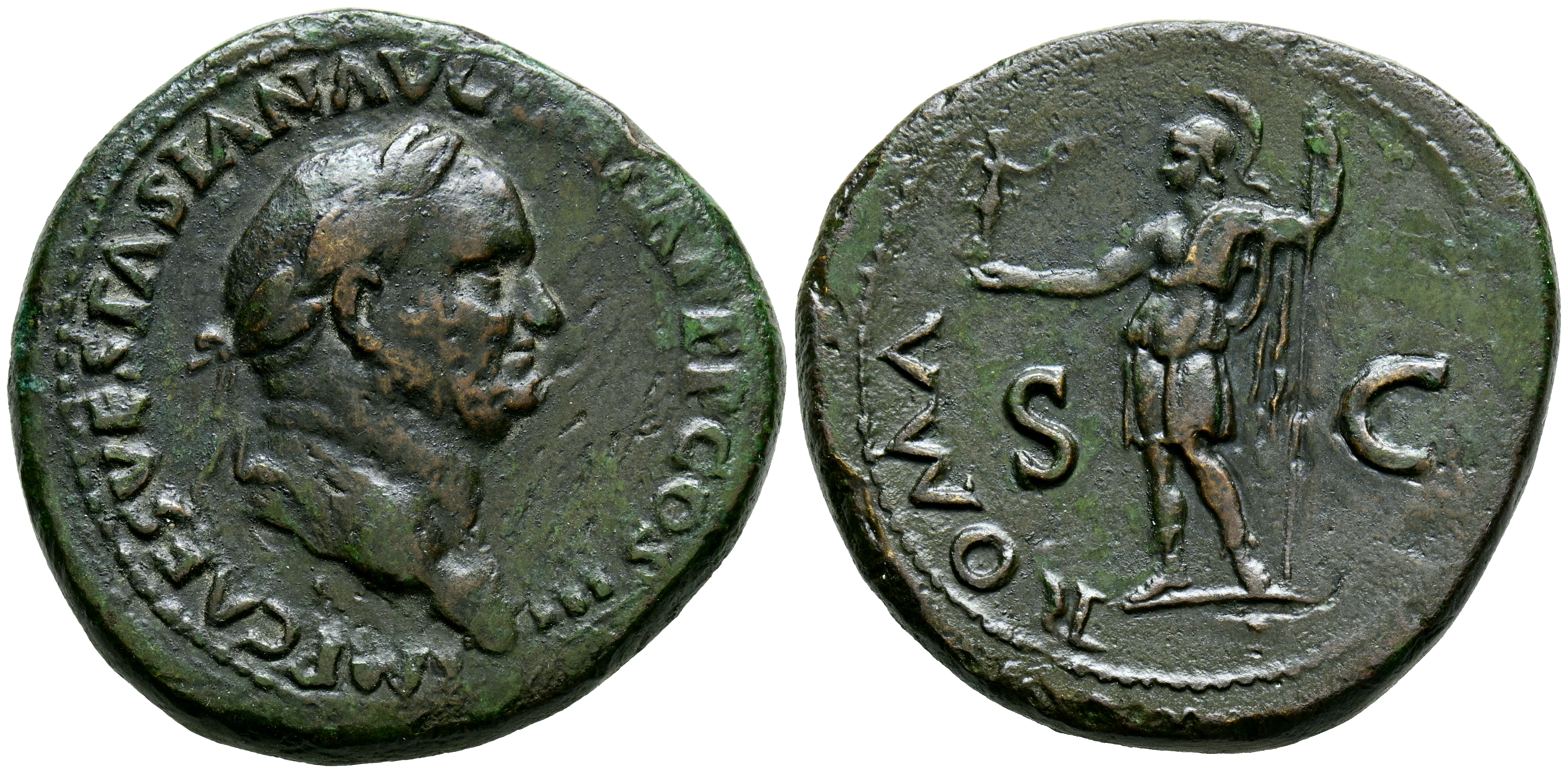 VESPASIANO. Sestercio. (Ae. 22,65g/35mm). 71 d.C. Roma. (RIC 190). Anv: Cabeza laureado de Vespasiano a derecha, alrededor leyenda: IMP CAES VESPASIAN AVG P M TR P P P COS III. Rev: Roma estante a izquierda portando Victoria sobre globo y cetro, entre: S-C, delante leyenda: ROMA. MBC/MBC+.