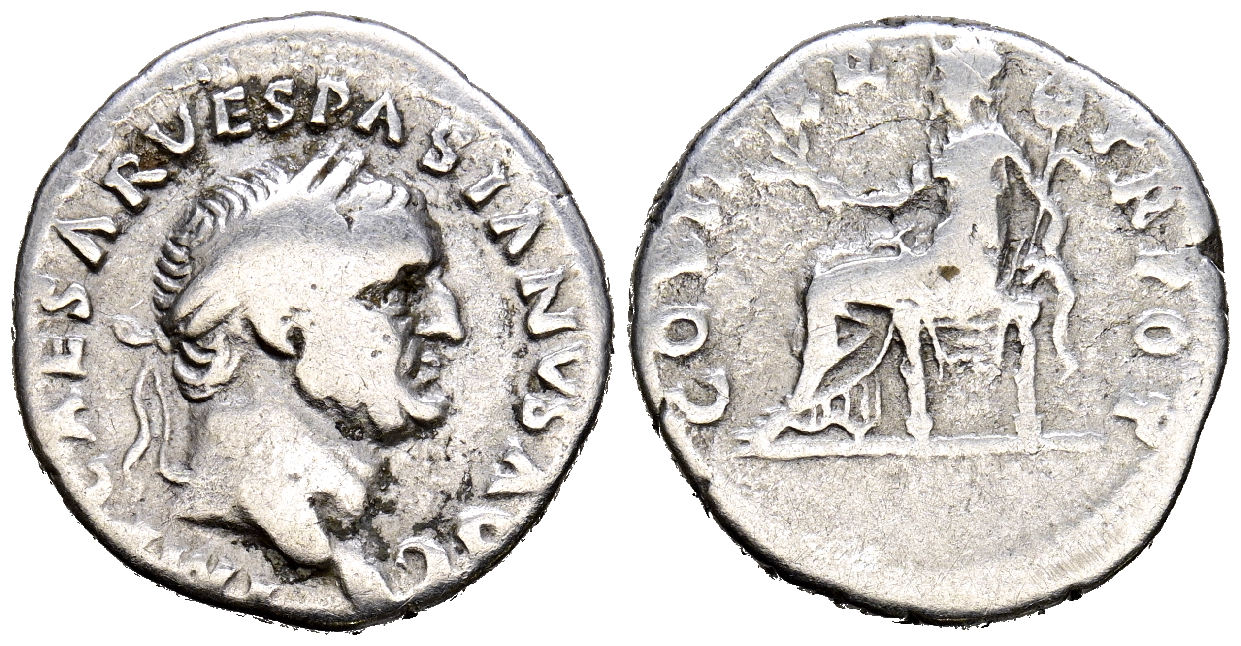 VESPASIANO. Denario. (Ar. 3,11g/18mm). 69-79 d.C. Roma. (RIC 29). Anv: Cabeza laureada de Vespasiano a derecha, alrededor leyenda: IMP CAESAR VESPASIANVS AVG. Rev: Pax sedente a izquierda portando rama y caduceo, alrededor leyenda: COSITER TR POT. MBC-/BC+.