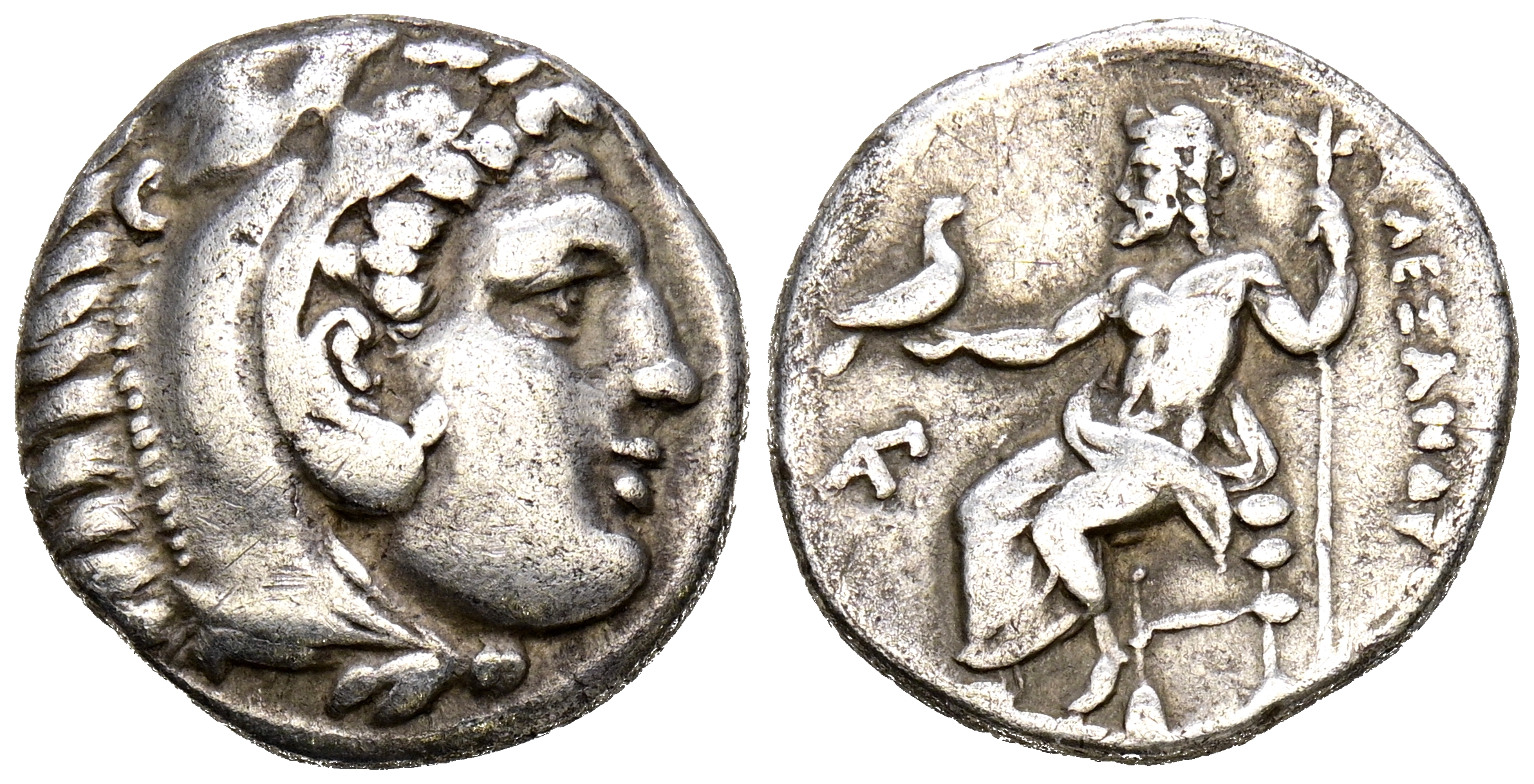 REYES DE MACEDONIA, Alejandro III el Grande. Dracma. (Ar. 4,11g/17mm). 336-323 a.C. Lampsacos. (Price 2090). Anv: Cabeza de Heracles con piel de león a derecha. Rev: Zeus sedente a izquierda portando cetro y águila, delante monograma griego, detrás l ey enda griega: AΛEΞANΔPOY. MBC.
