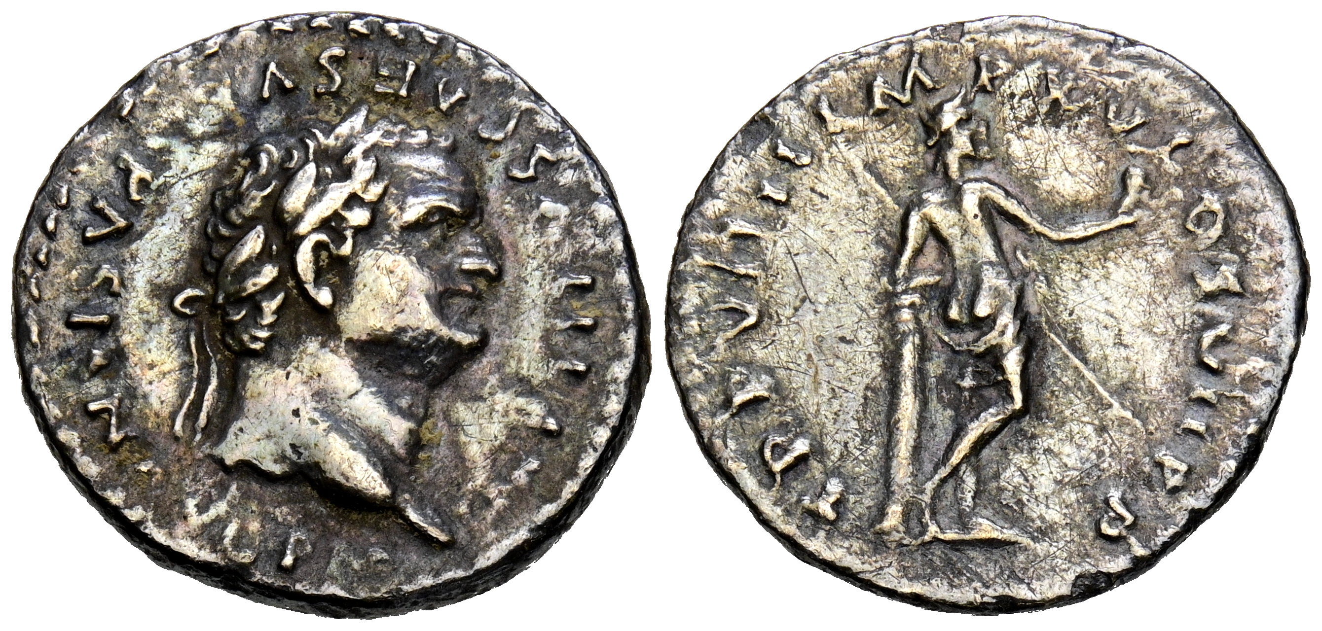 TITO. Denario. (Ar. 2,40g/19mm). 79 d.C. Roma. (RIC 34). Anv: Cabeza laureada de Tito a derecha, alrededor leyenda: IMP TITVS CAES VESPASIAN AVG P M. Rev: Venus estante a derecha portando cetro y casco y apoyado sobre columna, alrededor leyenda: TR P VIIII IMP XIIII COS VII P P. MBC+. Escaso ejemplar.