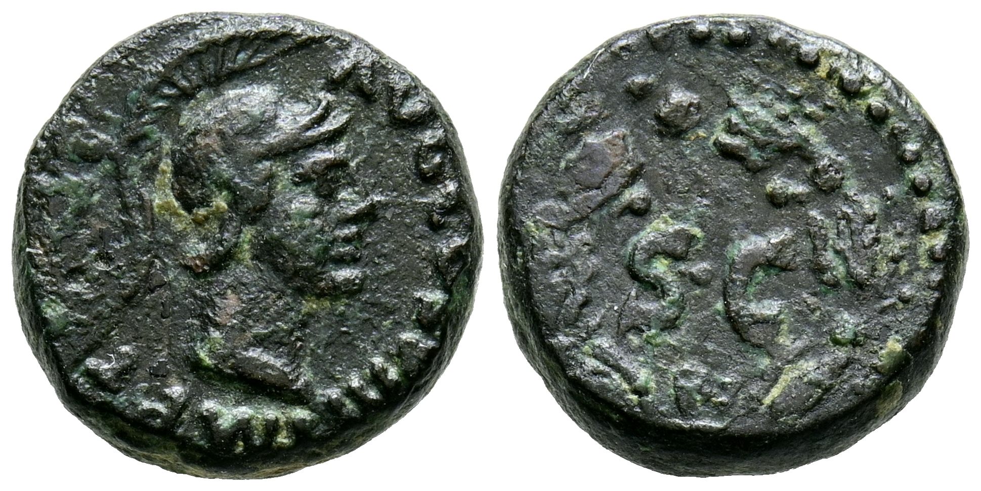 DOMICIANO. Cuadrante. (Ae. 2,71g/13mm). 81-82 d.C. Roma. (RIC 254). Anv: Cabeza de Minerva con casco a derecha, alrededor leyenda: IMP T VESP AVG COS VIII. Rev: SC, dentro de corona de laurel. MBC+/MBC.