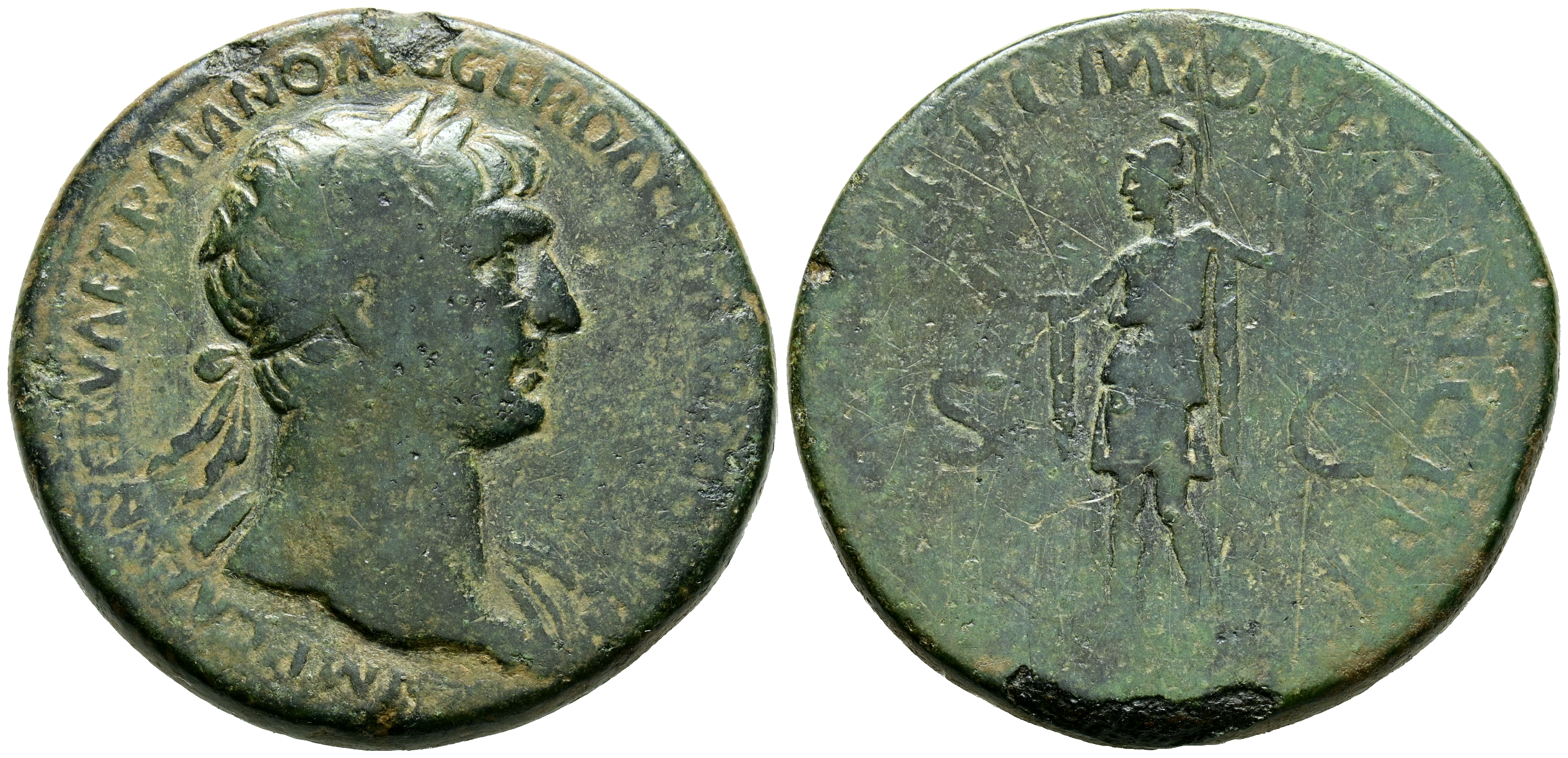 TRAJANO. Sestercio. (Ae. 23,08g/34mm). 107-108 d.C. Roma. (RIC 483). Anv: Busto laureado con ligero drapeado sobre hombro izquierdo de Trajano a derecha, alrededor leyenda: IMP CAES NERVAE TRAIANO AVG GER DAC P M TR P COS V P P. Rev: Roma estante a izquierda portando Victoria con corona de laurel y lanza, entre S-C, alrededor leyenda: SPQR OPTIMO PRINCIPI. MBC-.