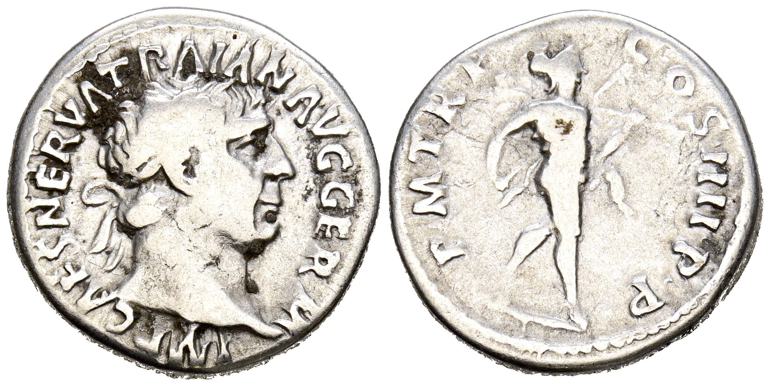 TRAJANO. Denario. (Ar. 3,19g/19mm). 101-102 d.C. Roma. (RIC 52). Anv: Cabeza laureada de Trajano a derecha, alrededor leyenda: IMP CAES NERVA TRAIAN AVG GERM. Rev: Marte avanzando a derecha portando lanza y trofeo, alrededor leyenda: P M TR P COS IIII P P. MBC.
