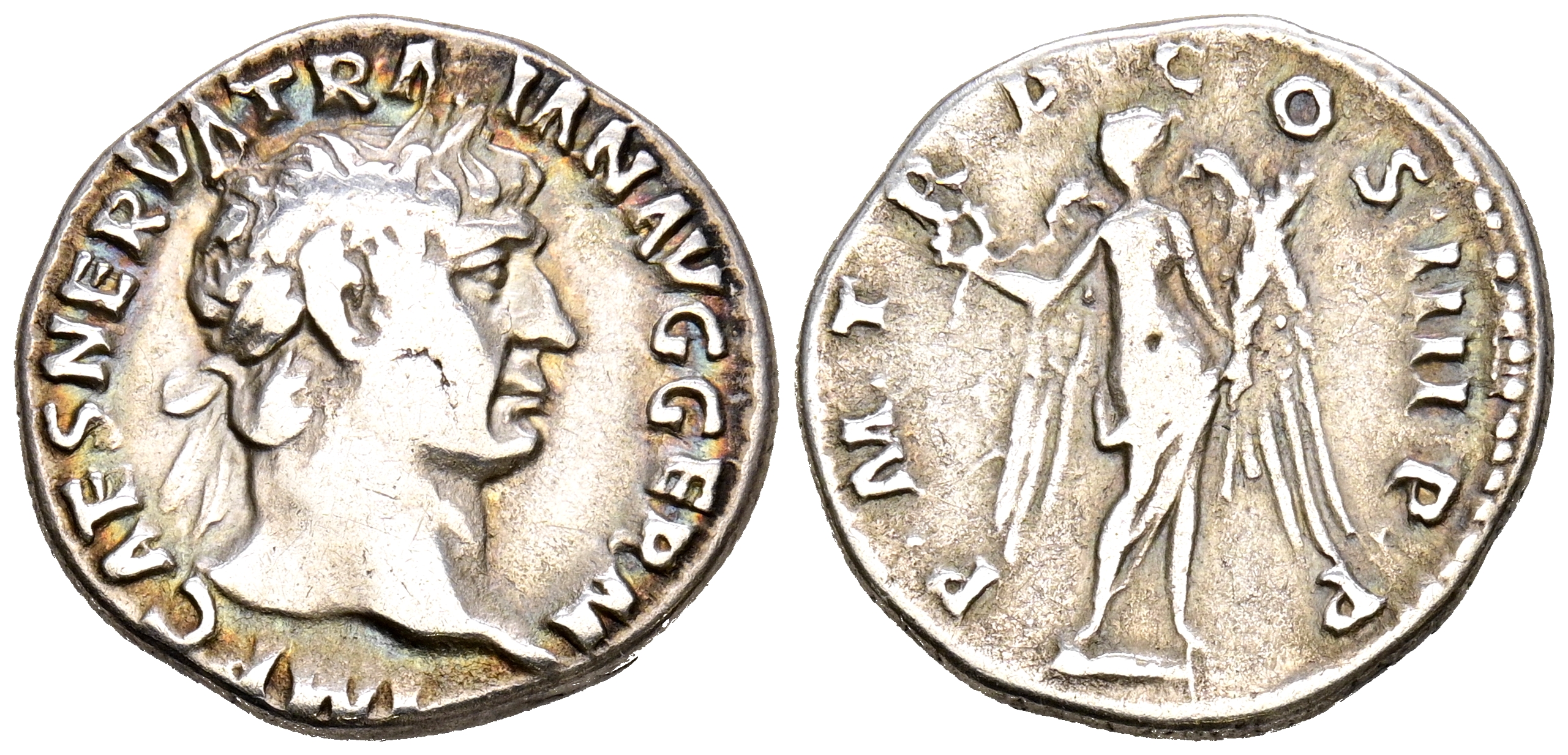 TRAJANO. Denario. (Ar. 3,22g/18mm). 102 d.C. Roma. (RIC 60). Anv: Cabeza laureada de Trajano a derecha, alrededor leyenda: IMP CAES NERVA TRAIAN AVG GERM. Rev: Victoria avanzando a izquierda portando corona de laurel y palma, alrededor leyenda: P M TR P COS IIII P P. MBC.