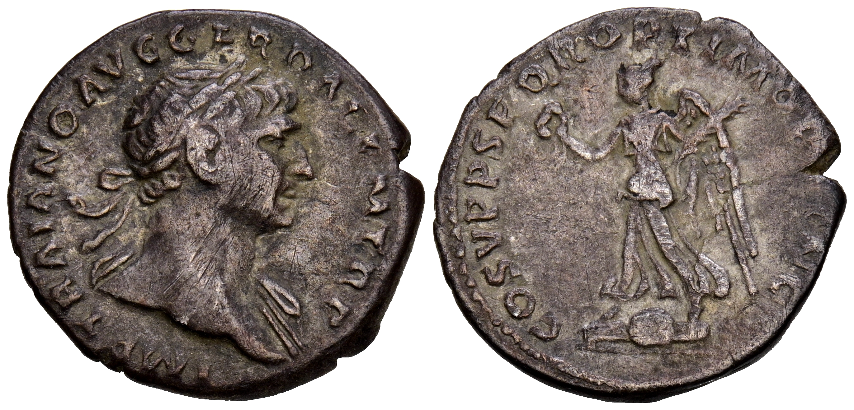 TRAJANO. Denario. (Ar. 3,03g/19mm). 107-108 d.C. Roma. (RIC 128). Anv: Drapeado laureado de Trajano con drapeado sobre hombro izquierdo, alrededor leyenda: IMP TRAIANO AVG GER DAC P M TR P. Rev: Victoria estante a izquierda portando corona de laurel y palma, alrededor leyenda: COS V P P SPQR OPTIMO PRINC. MBC.