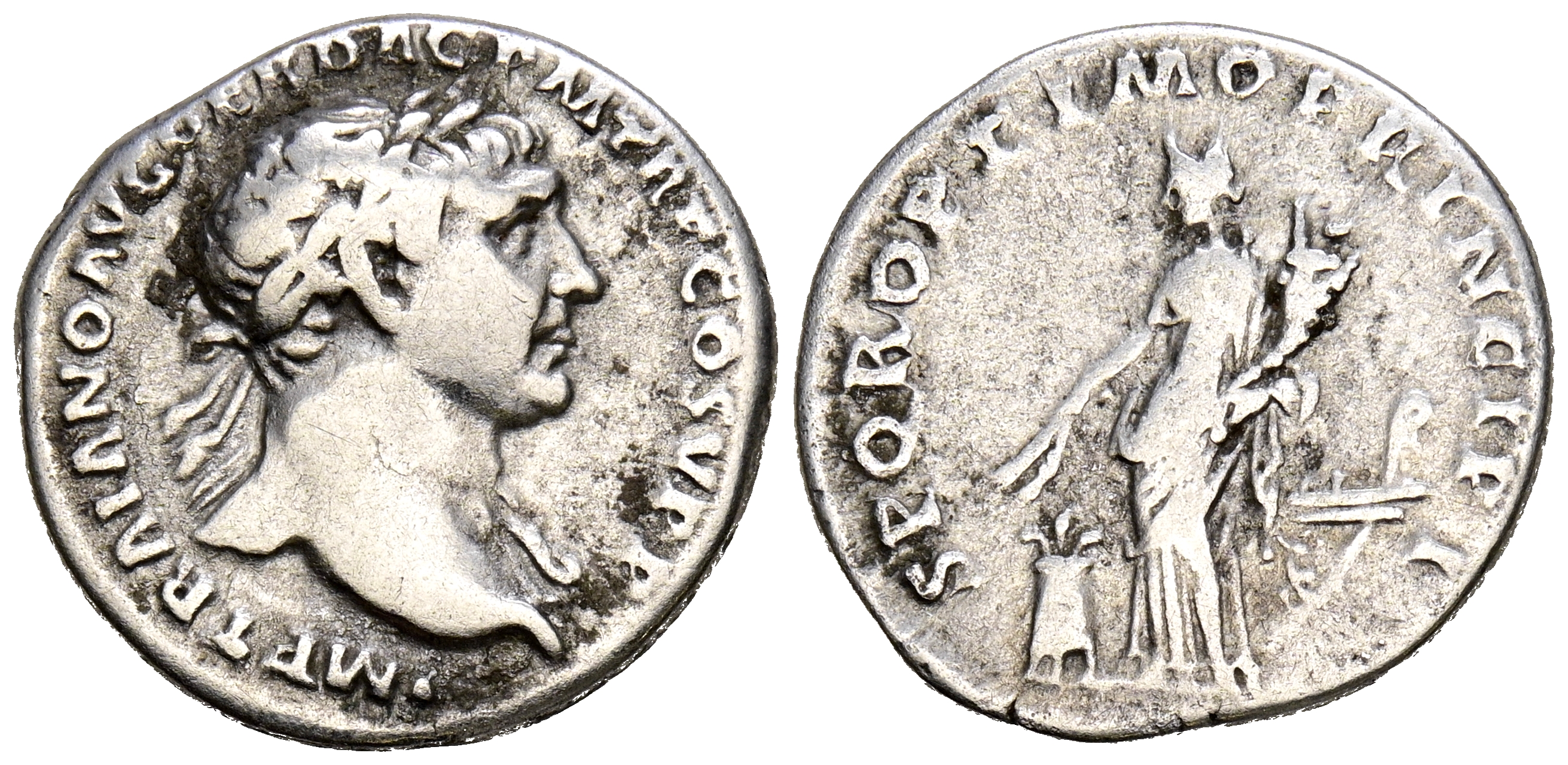 TRAJANO. Denario. (Ar. 3,07g/18mm). 107 d.C. Roma. (RIC 166). Anv: Cabeza laureada de Trajano a derecha, alrededor leyenda: IMP TRAIANO AVG GER DAC P M TR P COS V PP. Rev: Annona estante a izquierda con espigas y cornucopia, a sus pies modio, detrás proa, alrededor leyenda: SPQR OPTIMO PRINCIPI. MBC-.