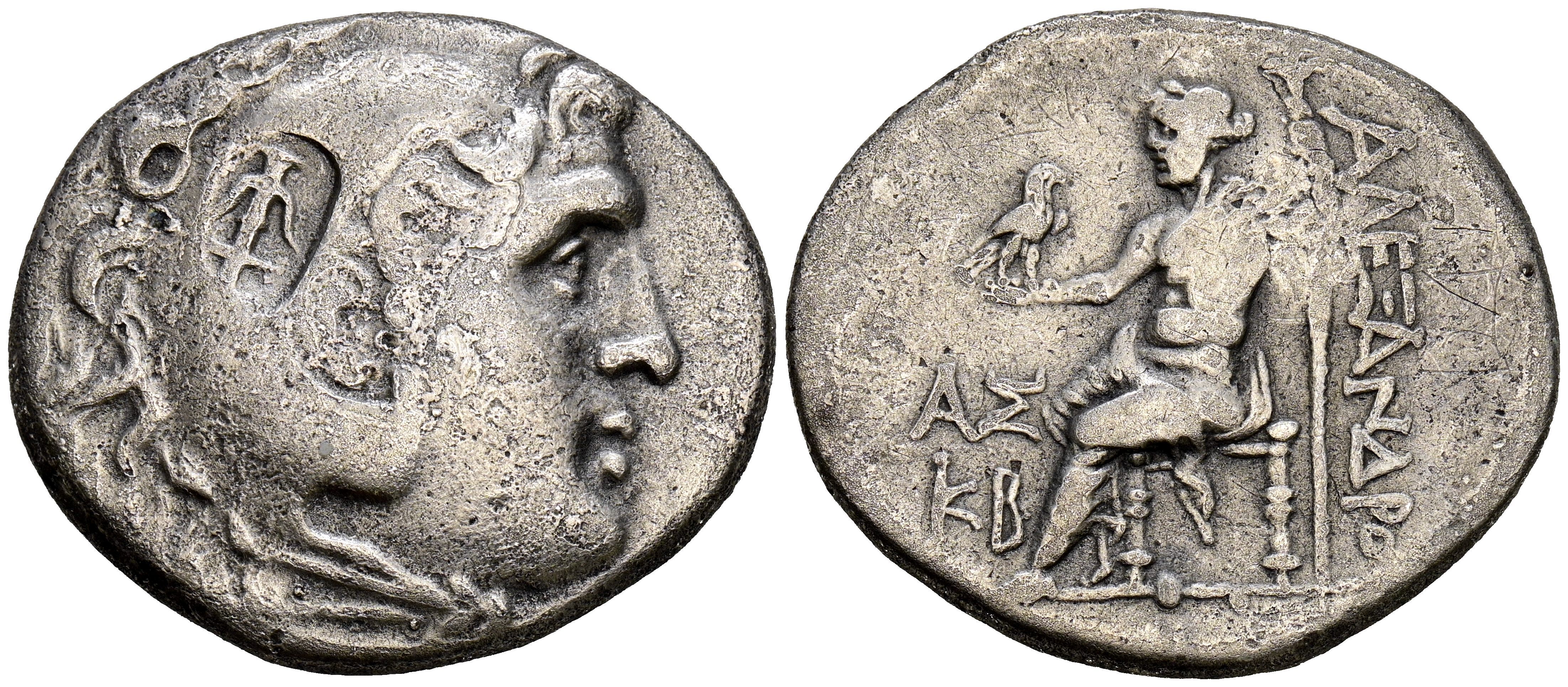 REYES DE MACEDONIA, Alejandro III el Grande. Tetradracma. (Ar. 16,00g/31mm). 212-181 a.C. Pamphylia, Aspendos. (Price 2903). Anv: Cabeza de Heracles a derecha recubierta con piel de león. Rev: Zeus sentado a izquierda con cetro y águila, debajo del t rono águila, delante: AΣ/KB, detrás leyenda: AΛEΞANΔΡOY. Contramarca de ancla Seleucida dentro de rectángulo incuso, en anverso. MBC-.