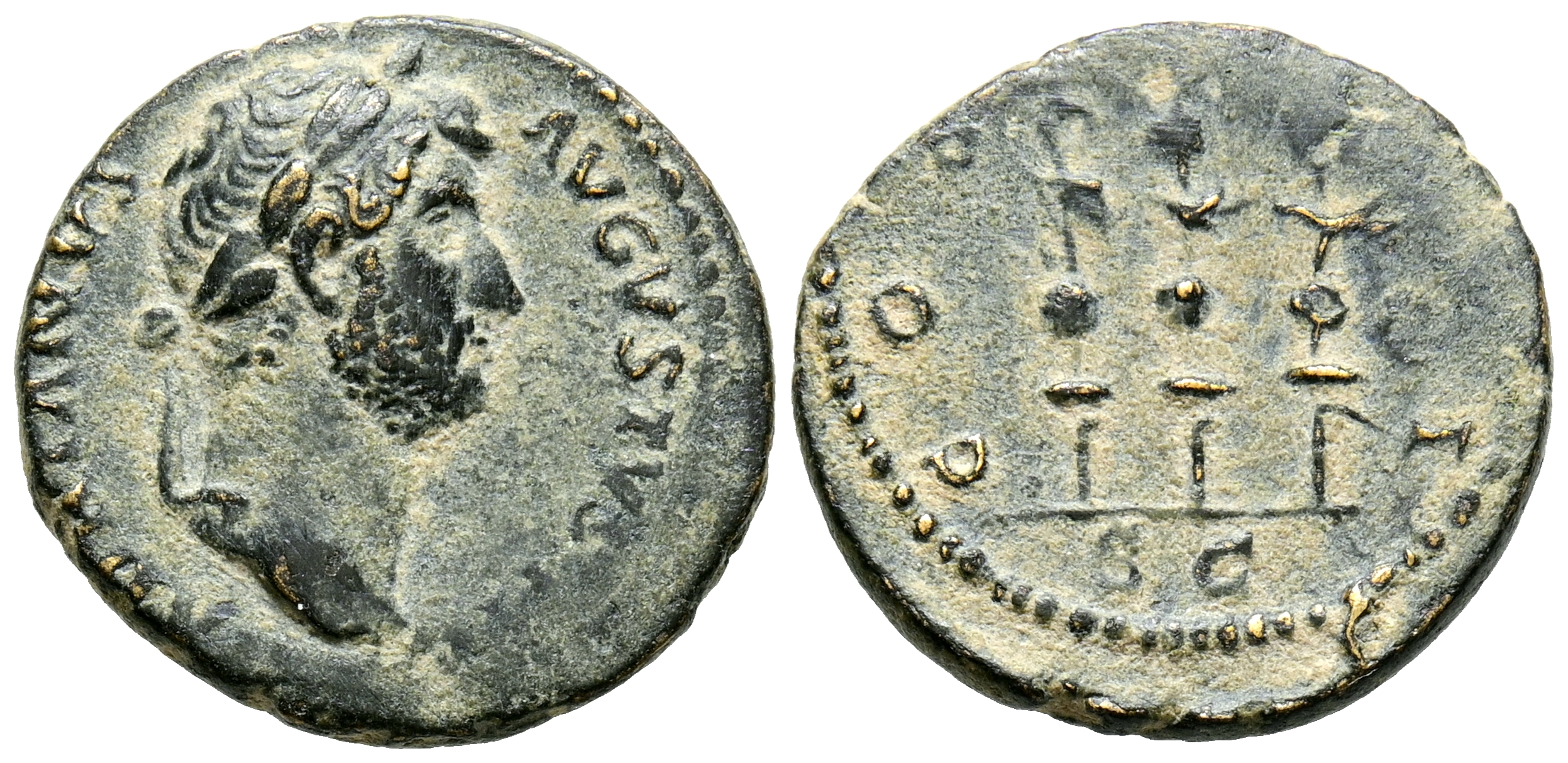 ADRIANO. Cuadrante. (Ae. 3,05g/17mm). 125-128 d.C. Roma. (RIC 689). Anv: Cabeza laureada de Adriano a derecha, alrededor leyenda: HADRIANVS AVGVSTVS. Rev: Aguila imperial sobre tres estandartes, en exergo: SC, alrededor leyenda: COS III. MBC.
